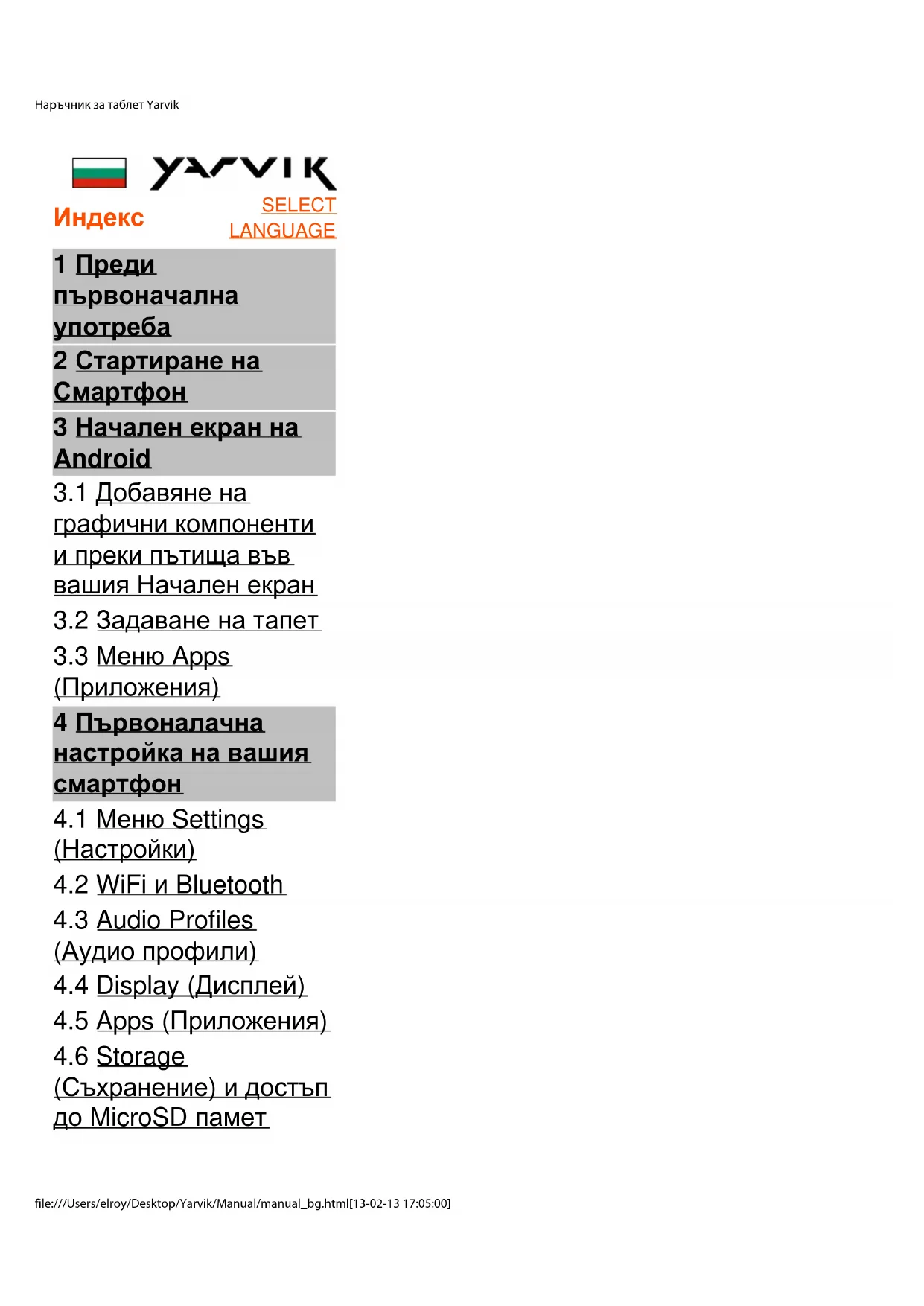 Меню SettingsНаръчник за таблет Yarvik file:///Users/elroy/Desktop/Yarvik/Manual/manual_bg.html[13-02-13 17:05:00] (Настройки) Натиснете иконата Настройки в менюто Приложения, за да влезете в менюто Settings (Настройки). В меню Settings (Настройки) можете да намерите опциите за настройка на вашия смартфон Yarvik.Наръчник за таблет Yarvik file:///Users/elroy/Desktop/Yarvik/Manual/manual_bg.html[13-02-13 17:05:00] Меню настройки Ще преминем през най-важните части: Връщане към
