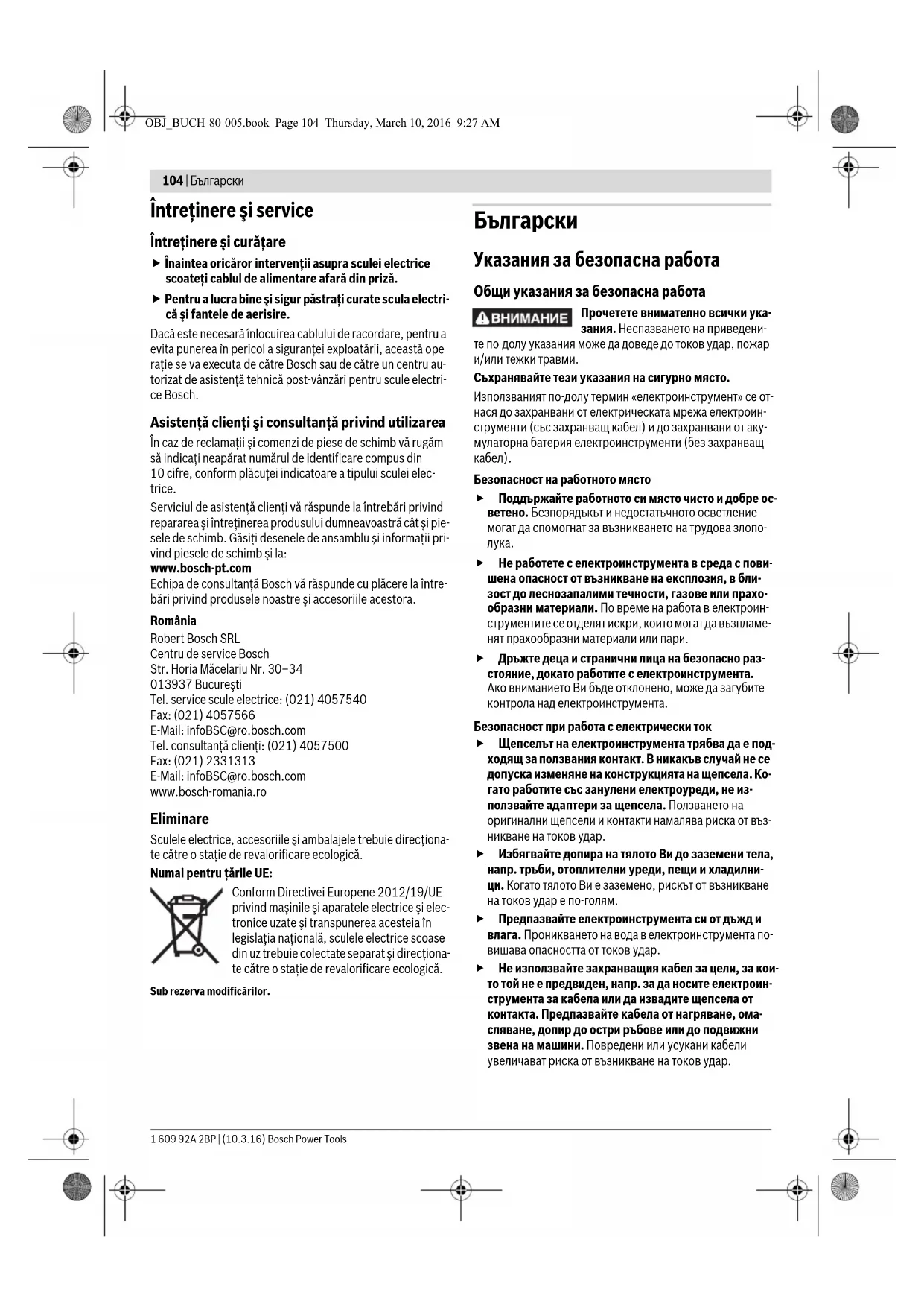93 x 185 93 x 230 Размери на шлифоващата плоча mm 92 x 182 Маса съгласно EPTA-Procedure 01:2014 kg 1,7 Клас на защита /II Данните се отнасят до номинално напрежение [U] 230 V. При раз- лично напрежение, както и при специалните изпълнения за някои страни данните могат да се различават. OBJ_BUCH-80-005.book Page 106 Thursday, March 10, 2016 9:27 AMБългарски | 107 Bosch Power Tools 1 609 92A 2BP | (10.3.16) ван за други дейности, с различни работни инструменти или без необходимото техническо обслужване, нивото на вибрациите може да се различава. Това би могло да увели- чи значително сумарното натоварване от вибрации в про- цеса на работа. За точната преценка на натоварването от вибрации трябва да бъдат взимани предвид и периодите, в които електро- инструментът е изключен или работи, но не се ползва. То- ва би могло значително да намали сумарното натоварване от вибрации. Предписвайте допълнителни мерки за предпазване на ра- ботещия с електроинструмента от въздействието на ви- брациите, например: техническо обслужване на електроинструмента и работните инструменти, поддържа- не на ръцете топли, целесъобразна организация на работ- ните стъпки. Декларация за съответствие С пълна отговорност ние декларираме, че описаният в раздела «Технически данни» съответства на всички валид- ни изисквания на директивите 2011/65/EС, до 19 април 2016: 2004/108/EО, от 20 април 2016: 2014/30/EС, 2006/42/EО, включително на измененията им и покрива изискванията на стандартите: EN 60745-1, EN 60745-2-4, EN 50581. Техническа документация (2006/42/ЕО) при: Robert Bosch Power Tools GmbH, PT/ETM9, 70538 Stuttgart, GERMANY Robert Bosch Power Tools GmbH 70538 Stuttgart, GERMANY Stuttgart, 01.01.2017