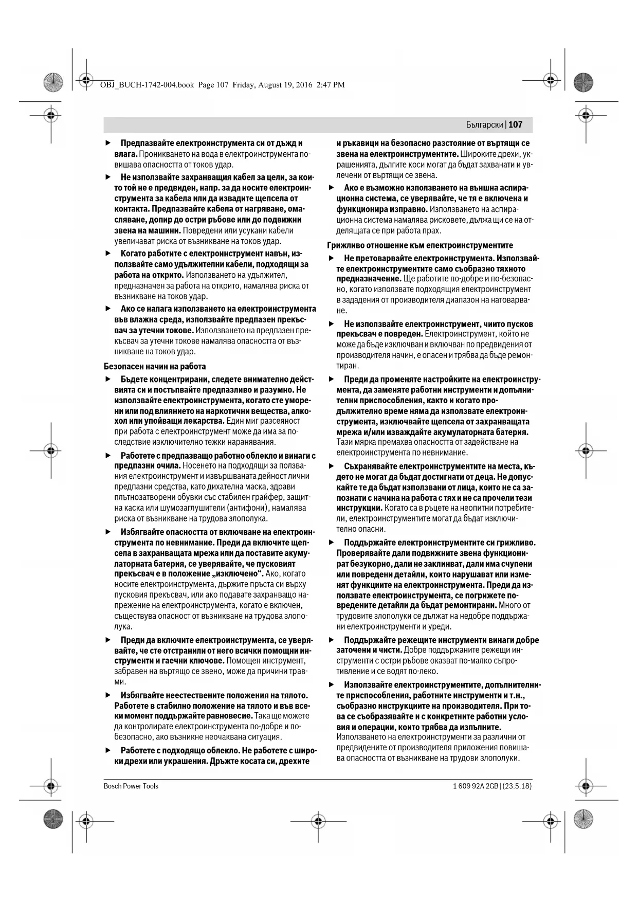 зменяне на конструкцията на щепсела. Ко- гато работите със занулени електроуреди, не из- ползвайте адаптери за щепсела. Ползването на оригинални щепсели и контакти намалява риска от въз- никване на токов удар. Избягвайте допира на тялото Ви до заземени тела, напр. тръби, отоплителни уреди, пещи и хладилни- ци. Когато тялото Ви е заземено, рискът от възникване на токов удар е по-голям. OBJ_BUCH-1742-004.book Page 106 Friday, August 19, 2016 2:47 PMБългарски | 107 Bosch Power Tools 1 609 92A 2GB | (23.5.18) Предпазвайте електроинструмента си от дъжд и влага. Проникването на вода в електроинструмента по- вишава опасността от токов удар. Не използвайте захранващия кабел за цели, за кои- то той не е предвиден, напр. за да носите електроин- струмента за кабела или да извадите щепсела от контакта. Предпазвайте кабела от нагряване, ома- сляване, допир до остри ръбове или до подвижни звена на машини. Повредени или усукани кабели увеличават риска от възникване на токов удар. Когато работите с електроинструмент навън, из- ползвайте само удължителни кабели, подходящи за работа на открито. Използването на удължител, предназначен за работа на открито, намалява риска от възникване на токов удар. Ако се налага използването на електроинструмента във влажна среда, използвайте предпазен прекъс- вач за утечни токове. Използването на предпазен пре- късвач за утечни токове намалява опасността от въз- никване на токов удар. Безопасен начин на работа Бъдете концентрирани, следете внимателно дейст- вията си и постъпвайте предпазливо и разумно. Не използвайте електроинструмента, когато сте уморе- ни или под влиянието на наркотични вещества, алко- хол или упойващи лекарства. Един миг разсеяност при работа с електроинструмент може да има за по- следствие изключително тежки наранявания. Работете с предпазващо работно облекло и винаги с предпазни очила. Носенето на подходящи за ползва- ния електроинструмент и извършваната дейност лични предпазни средства, като дихателна маска, здрави плътнозатворени обувки със стабилен грайфер, защит- на каска или шумозаглушители (антифони), намалява риска от възникване на трудова злополука. Избягвайте опасността от включване на електроин- струмента по невнимание. Преди да включите щеп- села в захранващата мрежа или да поставите акуму- латорната батерия, се уверявайте, че пусковият прекъсвач е в положение „изключено“. Ако, когато носите електроинструмента, държите пръста си върху пусковия прекъсвач, или ако подавате захранващо на- прежение на електроинструмента, когато е включен, съществува опасност от възникване на трудова злопо-
