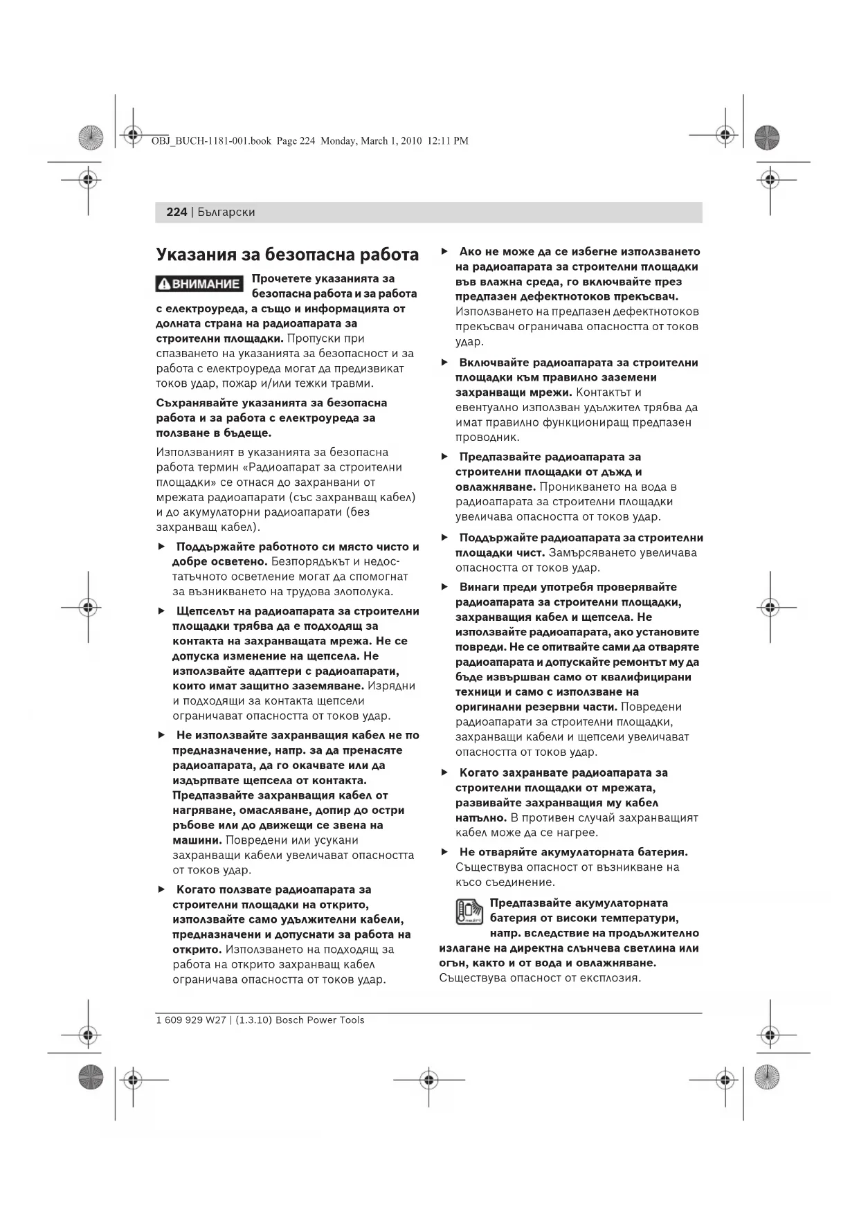 С оглед опазване на околната среда радиоапаратът за строителни площадки, допълнителните принадлежности и опаковките трябва да бъдат предавани за вторична преработка. Само за страни от ЕС: Не изхвърляйте радиоапарата за строителни площадки при битовите отпадъци! Съгласно Европейска директива 2002/96/EО относно излязла от употреба електрическа и електронна апаратура и утвърждаването й като национален закон електрическите и електронни устройства, които не могат да се използват повече, трябва да се събират отделно и да бъдат подлагани на подходяща преработка за оползотворяване на съдържащите се в тях суровини. Акумулаторни или обикновени батерии: Li-Ion: Моля, спазвайте указанията в раздел «Транспортиране», страница 235. Не изхвърляйте акумулаторни или обикновени батерии при битовите отпадъци или във водохранилища, не ги изгаряйте. Обикновени или акумулаторни батерии трябва по възможност предварително да бъдат разреждани докрай и събирани и рециклирани или изхвърляни по начин, който не замърсява околната среда. Само за страни от ЕС: съгласно Директива 2006/66/ЕО дефектни или изхабени акумулаторни или обикновени бате- рии трябва да бъдат рециклирани. Правата за изменения запазени. OBJ_BUCH-1181-001.book Page 235 Monday, March 1, 2010 12:11 PM236 | Srpski 1 609 929 W27 | (1.3.10) Bosch Power Tools
