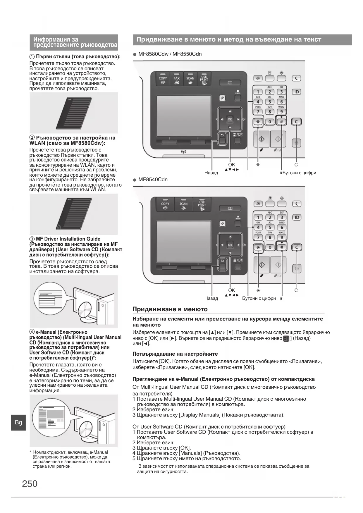 информация. * Компактдискът, включващ e-Manual (Електронно ръководство), може да се различава в зависимост от вашата страна или регион. Придвижване в менюто и метод на въвеждане на текст