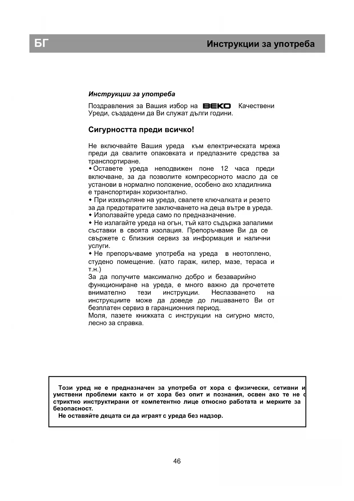 Безопасност преди всичко /46 Електрически изисквания /47 Tранспортнu uнструкции /47 Инструкции при инсталиране /47 Запознаване с вашия уред /48 Препоръки при подреждане на храната /48 Контрол на температурата и настройки /49 Преди работа /49 Съхранение на замразени храни /49 Замразяване на свежи продукти /50 Лед /50 Размразяване /50 Подмяна на лампичката от вътрешното осветление /51 Почистване и грижи /51 Промяна посоката на отваряне на вратата /51 Полезни съвети /52 Разход на енергия /53 Информация за шумовете и вибрациите /53 Разрешение на проблеми /54 Технически характеристики /54