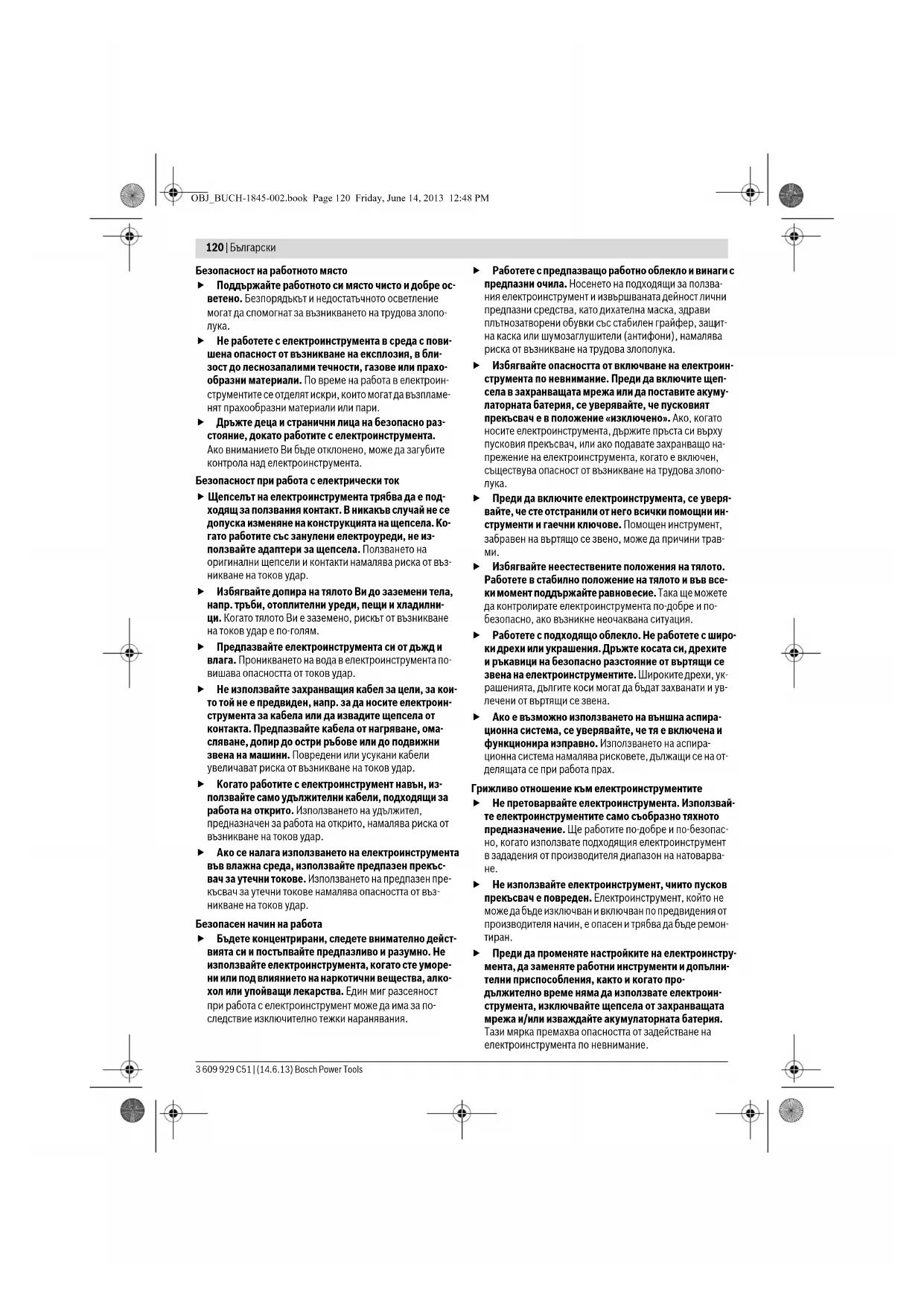 OBJ_BUCH-1845-002.book Page 119 Friday, June 14, 2013 12:48 PM120 | Български 3 609 929 C51 | (14.6.13) Bosch Power Tools Безопасност на работното място Поддържайте работното си място чисто и добре ос- ветено. Безпорядъкът и недостатъчното осветление могат да спомогнат за възникването на трудова злопо-