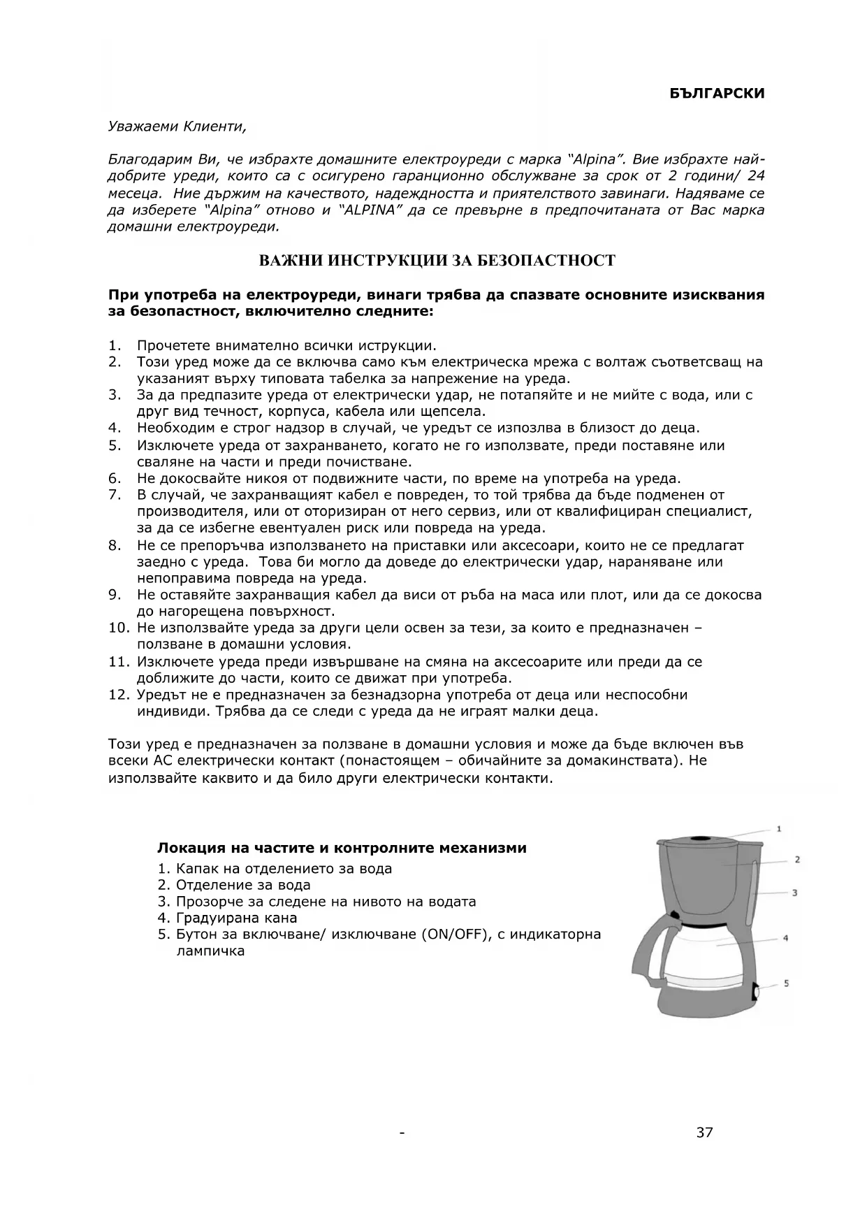 Уважаеми Клиенти, Благодарим Ви, че избрахте домашните електроуреди с марка “Alpina”. Вие избрахте най- добрите уреди, които са с осигурено гаранционно обслужване за срок от 2 години/ 24 месеца. Ние държим на качеството, надеждността и приятелството завинаги. Надяваме се да изберете “Alpina” отново и “ALPINA” да се превърне в предпочитаната от Вас марка домашни електроуреди. ВАЖНИ ИНСТРУКЦИИ ЗА БЕЗОПАСТНОСТ При употреба на електроуреди, винаги трябва да спазвате основните изисквания за безопастност, включително следните: