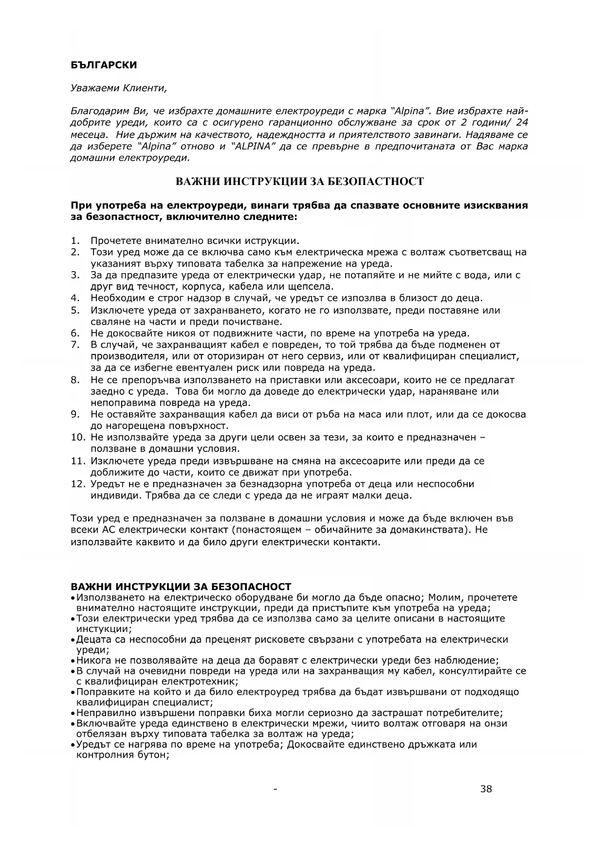 Уважаеми Клиенти, Благодарим Ви, че избрахте домашните електроуреди с марка “Alpina”. Вие избрахте най- добрите уреди, които са с осигурено гаранционно обслужване за срок от 2 години/ 24 месеца. Ние държим на качеството, надеждността и приятелството завинаги. Надяваме се да изберете “Alpina” отново и “ALPINA” да се превърне в предпочитаната от Вас марка домашни електроуреди. ВАЖНИ ИНСТРУКЦИИ ЗА БЕЗОПАСТНОСТ При употреба на електроуреди, винаги трябва да спазвате основните изисквания за безопастност, включително следните: