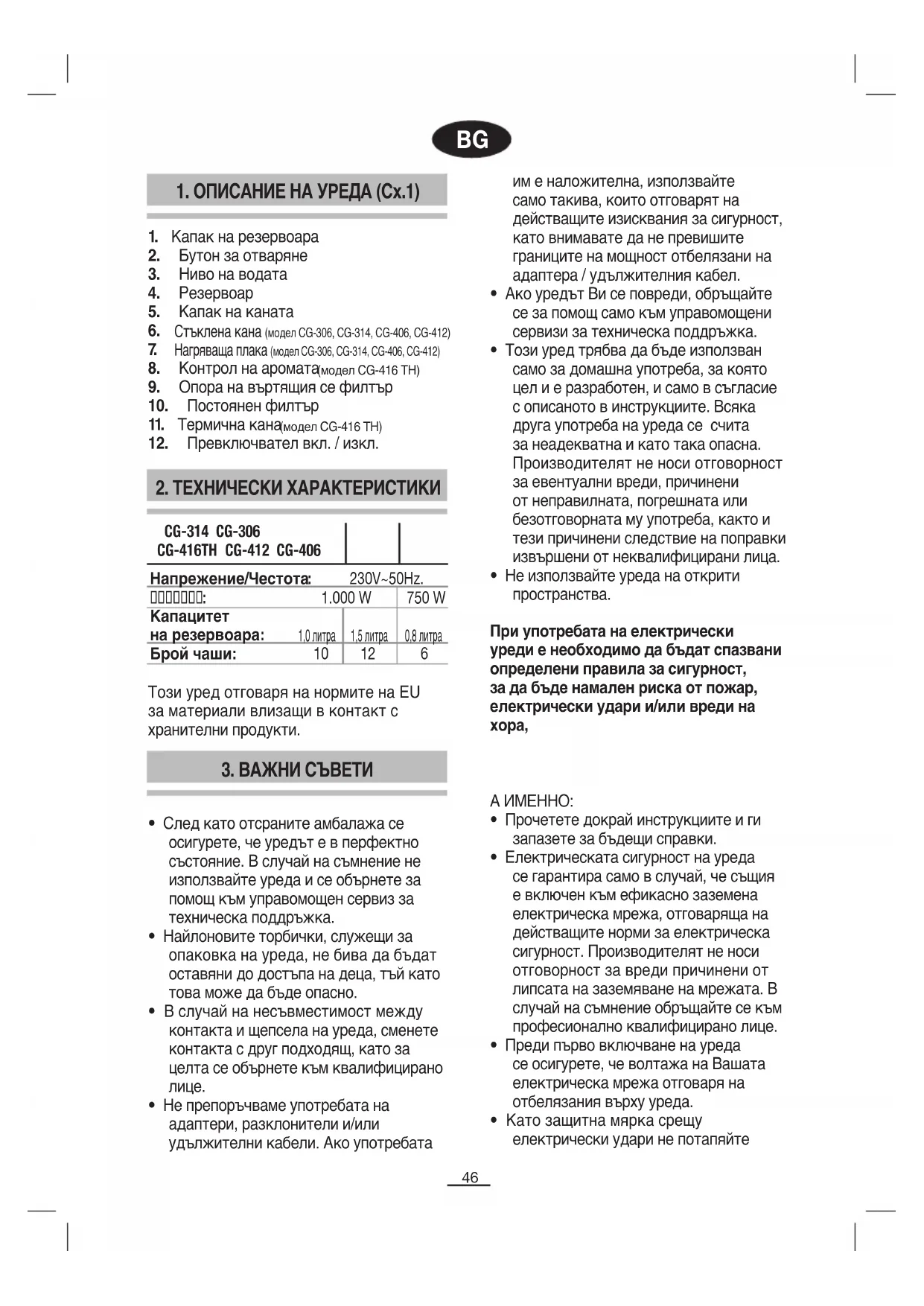 - Като защитна мярка срещу електрически удари не потапяйте CG-314 CG-306 CG-416TH CG-412 CG-406 Напрежение/Честота