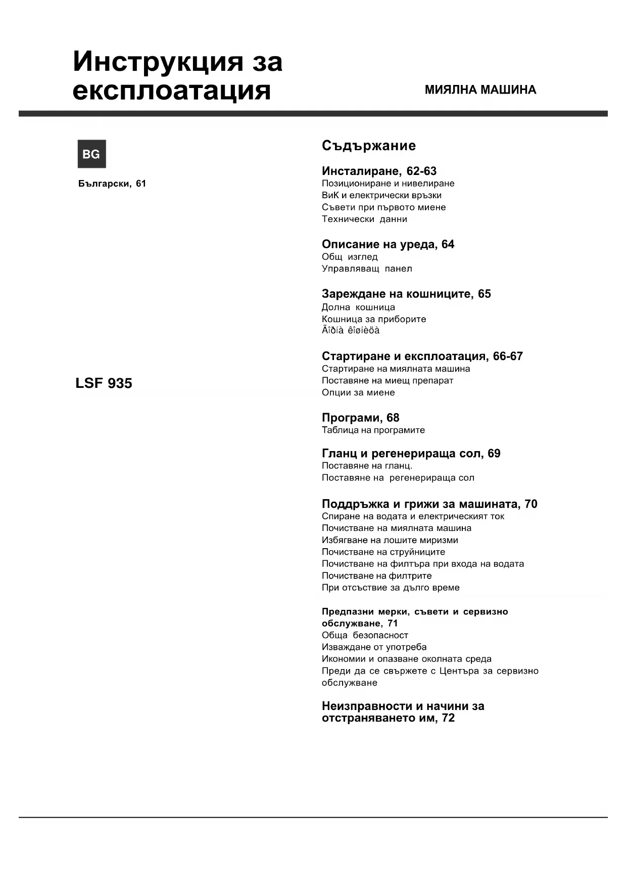 Управляващ панел Зареждане на кошниците, 65 Долна кошница Кошница за приборите Ãîðíà êîøíèöà Стартиране и експлоатация, 66-67 Стартиране на миялната машина Поставяне на миещ препарат Опции за миене Програми, 68 Таблица на програмите Гланц и регенерираща сол, 69 Поставяне на гланц. Поставяне на регенерираща сол Поддръжка и грижи за машината, 70 Спиране на водата и електрическият ток Почистване на миялната машина Избягване на лошите миризми Почистване на струйниците Почистване на филтъра при входа на водата Почистване на филтрите При отсъствие за дълго време Предпазни мерки, съвети и сервизно обслужване, 71 Обща безопасност Изваждане от употреба Икономии и опазване околната среда Преди да се свържете с Центъра за сервизно