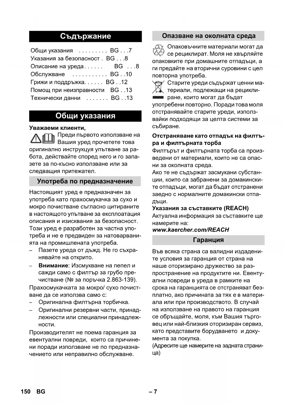 150 BG– 8 При въпроси и повреди Вашият дистри- бутор на KÄRCHER ще Ви помогне с удоволствие. (Адресите ще намерите на задната стра-