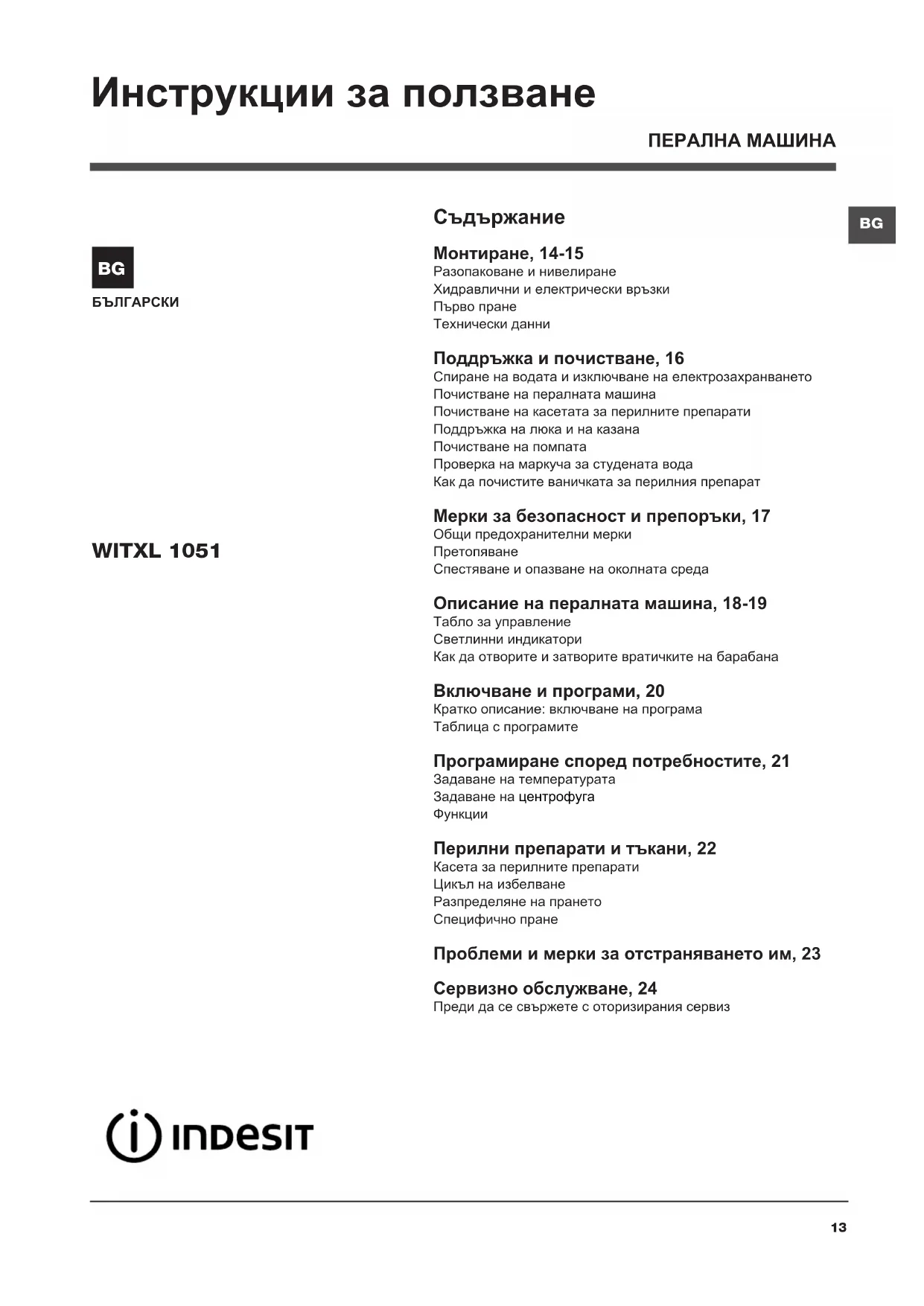Téléchargez la notice de votre Пералня au format PDF gratuitement ! Retrouvez votre notice WITXL 1051 - INDESIT et reprennez votre appareil électronique en main. Sur cette page sont publiés tous les documents nécessaires à l'utilisation de votre appareil WITXL 1051 de la marque INDESIT.