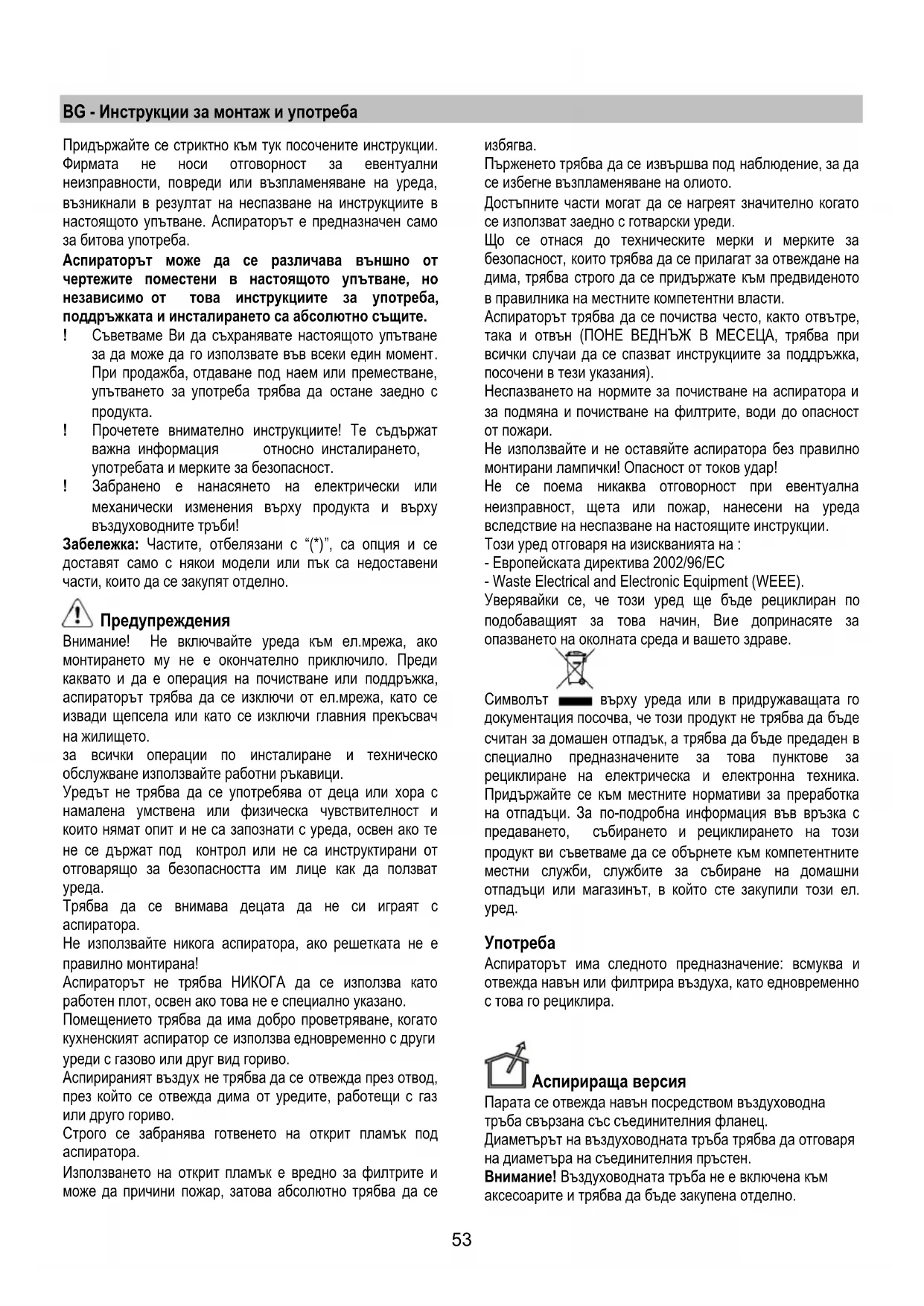 настоящото упътване. Аспираторът е предназначен само