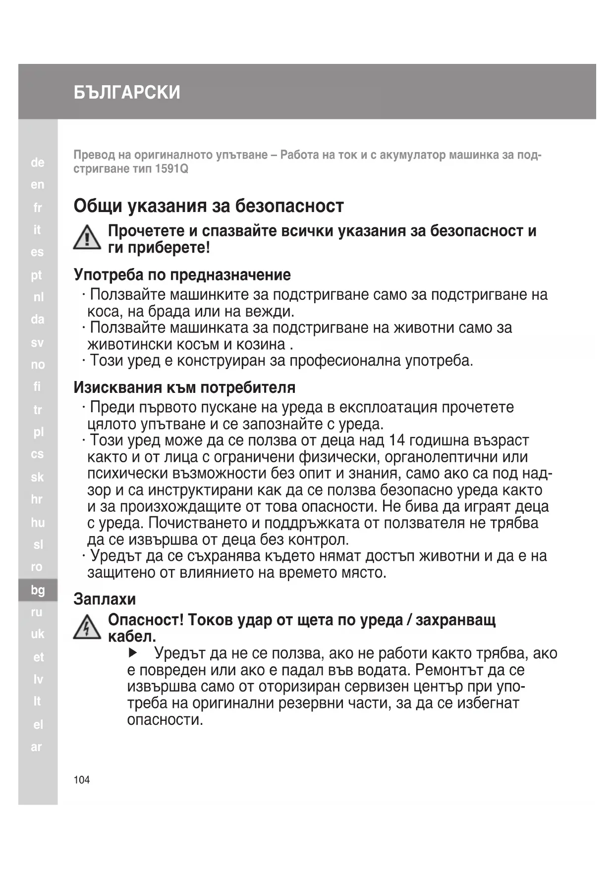 Превод на оригиналното упътване – Работа на ток и с акумулатор машинка за подстригване тип 1591Q 104