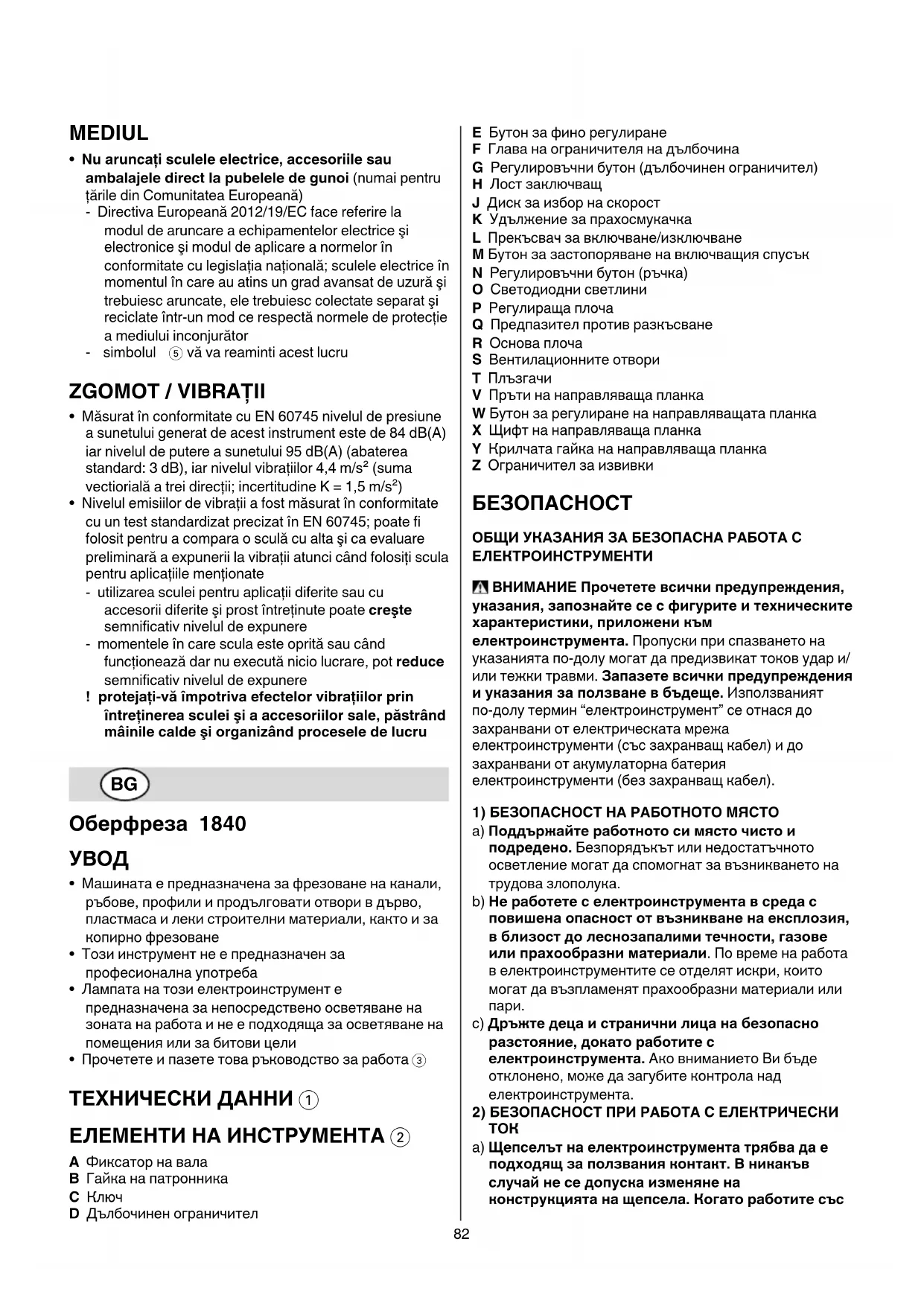 - Прочетете и пазете това ръководство за работа 3 ТЕXHИЧЕСКИ ДАННИ 1 ЕЛЕМЕНТИ НА ИНСТРУМЕНТА 2 A Фиксатоp на вала B Гайка на патронника C Ключ D Дълбочинен ограничител E Бутон за фино регулиране F Глава на ограничителя на дълбочина G Регулиpовъчни бутон (дълбочинен ограничител) H Лост заключващ J Диск за избор на скорост K Удължение за прахосмукачка L Прекъсвач за включване/изключване M Бутон за застопоpяване на включващия спусък N Регулиpовъчни бутон (ръчка) O Светодиодни светлини P Регулираща плоча Q Предпазител против разкъсване R Основа плоча S Вентилационните отвоpи T Плъзгачи V Пръти на направляваща планка W Бутон за регулиране на направляващата планка X Щифт на направляваща планка Y Крилчата гайка на направляваща планка Z Ограничител за извивки БЕЗОПАСНОСТ ОБЩИ УКАЗАНИЯ ЗА БЕЗОПАСНА РАБОТА С ЕЛЕКТРОИНСТРУМЕНТИ ВНИМАНИЕ Прочетете всички предупреждения, указания, запознайте се с фигурите и техническите характеристики, приложени към електроинструмента. Пропуски при спазването на указанията по-долу могат да предизвикат токов удар и/ или тежки травми. Запазете всички предупреждения и указания за ползване в бъдеще. Използваният по-долу термин “електроинструмент” се отнася до захранвани от електрическата мрежа електроинструменти (със захранващ кабел) и до захранвани от акумулаторна батерия електроинструменти (без захранващ кабел).