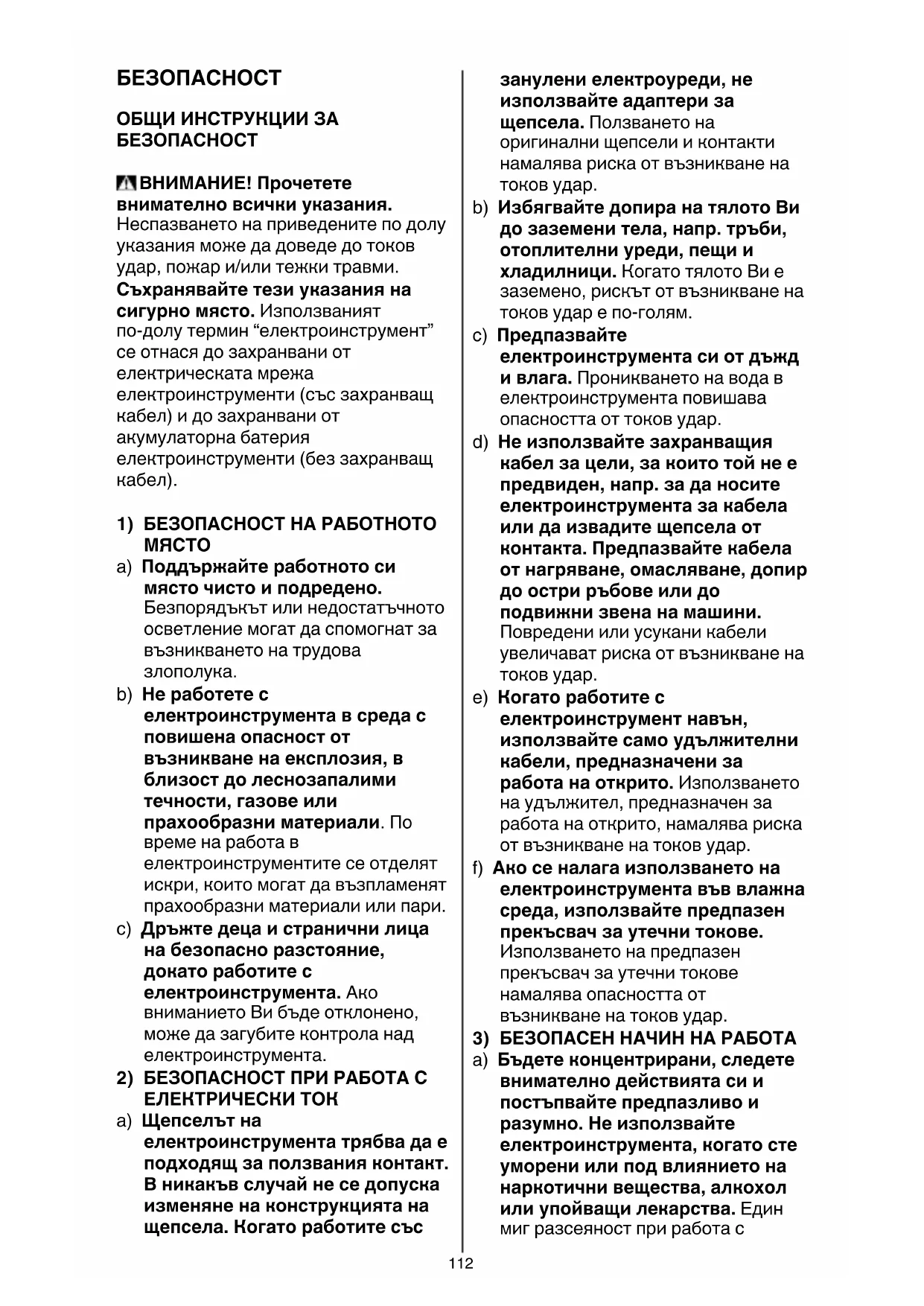 a) Бъдете концентрирани, следете внимателно действията си и постъпвайте предпазливо и разумно. Не използвайте електроинструмента, когато сте уморени или под влиянието на наркотични вещества, алкохол или упойващи лекарства. Един миг разсеяност при работа с113 електроинструмент може да има за последствие изключително тежки наранявания. b) Работете с предпазващо работно облекло и винаги с предпазни очила. Носенето на подходящи за ползвания електроинструмент и извършваната дейност лични предпазни средства, като дихателна маска, здрави плътнозатворени обувки със стабилен грайфер, защитна каска или шумозаглушители (антифони), намалява риска от възникване на трудова злополука. c) Избягвайте опасността от включване на електроинструмента по невнимание. Преди да включите щепсела в захранващата мрежа или да поставите акумулаторната батерия, се уверявайте, че пусковият прекъсвач е в положение изключено. Ако, когато носите електроинструмента, държите пръста си върху пусковия прекъсвач, или ако подавате захранващо напрежение на електроинструмента, когато е включен, съществува опасност от възникване на трудова злополука. d) Преди да включите електроинструмента, се уверявайте, че сте отстранили от него всички помощни инструменти и гаечни ключове. Помощен инструмент, забравен на въртящо се звено, може да причини