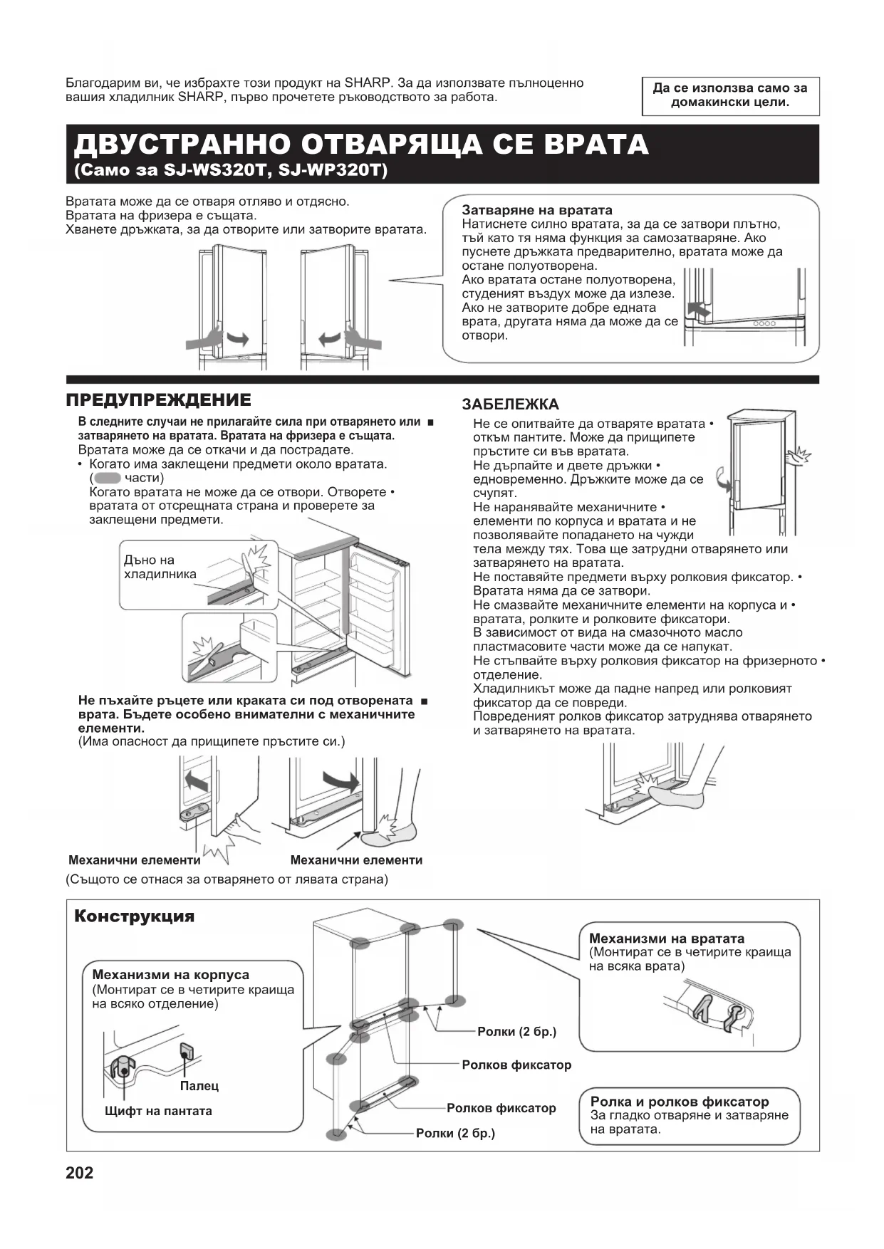 части)Когато вратата не може да се отвори. Отворете • вратата от отсрещната страна и проверете за заклещени предмети.Не пъхайте ръцете или краката си под отворената ■врата. Бъдете особено внимателни с механичните елементи.(Има опасност да прищипете пръстите си.) Не се опитвайте да отваряте вратата • откъм пантите. Може да прищипете пръстите си във вратата.Не дърпайте и двете дръжки • едновременно. Дръжките може да се счупят.Не наранявайте механичните • елементи по корпуса и вратата и не позволявайте попадането на чужди тела между тях. Това ще затрудни отварянето или затварянето на вратата.Не поставяйте предмети върху ролковия фиксатор. • Вратата няма да се затвори.Не смазвайте механичните елементи на корпуса и • вратата, ролките и ролковите фиксатори. В зависимост от вида на смазочното масло пластмасовите части може да се напукат.Не стъпвайте върху ролковия фиксатор на фризерното • отделение. Хладилникът може да падне напред или ролковият фиксатор да се повреди. Повреденият ролков фиксатор затруднява отварянето и затварянето на вратата. Конструкция ДВУСТРАННО ОТВАРЯЩА СЕ ВРАТА (Само за SJ-WS320T, SJ-WP320T) Вратата може да се отваря отляво и отдясно.Вратата на фризера е същата.Хванете дръжката, за да отворите или затворите вратата. Затваряне на вратата Натиснете силно вратата, за да се затвори плътно, тъй като тя няма функция за самозатваряне. Ако пуснете дръжката предварително, вратата може да остане полуотворена. Ако вратата остане полуотворена, студеният въздух може да излезе. Ако не затворите добре едната врата, другата няма да може да се отвори.(Същото се отнася за отварянето от лявата страна) Механизми на корпуса (Монтират се в четирите краища на всяко отделение)Ролков фиксаторРолки (2 бр.)Ролки (2 бр.)Ролков фиксатор Механизми на вратата (Монтират се в четирите краища на всяка врата) Ролка и ролков фиксатор За гладко отваряне и затваряне на вратата.Благодарим ви, че избрахте този продукт на SHARP. За да използвате пълноценно вашия хладилник SHARP, първо прочетете ръководството за работа.Дъно на хладилникаМеханични елементиПалецЩифт на пантатаМеханични елементи(B107)_BOOK-E.indb 202 2010/09/28 16:31:11213 Хладилникът съдържа запалим хладилен агент (R600a: ■ изобутан) и разпенващ агент (циклопентан). Спазвайте следните правила, за да предотвратите запалване и експлодиране. Охладителната система отзад и вътре в хладилника • съдържа хладилен агент. Пазете охладителната система от контакт с остри предмети. Не използвайте механични или други средства, за да • ускорите размразяването. (Хладилникът разполага със система за автоматично размразяване) Не използвайте електрически уреди вътре в • хладилника. Използвайте само специално посочените за • хладилно отделение лампи. Не блокирайте отворите по периферията на • хладилника. Не използвайте запалими спрейове, например боя, • в близост до хладилника. Това може да причини експлозия или пожар. Ако се получи пробив в охладителната система, не • пипайте електрическия контакт и не използвайте открит пламък. Отворете прозореца и проветрете помещението. Свържете се със сервиз, одобрен от SHARP. Хладилникът трябва да се изхвърли по съответния • начин. Занесете хладилника в завод за рециклиране на запалими хладилни агенти и разпенващи агенти. Не съхранявайте силно летливи и запалими материали ■ като етер, бен