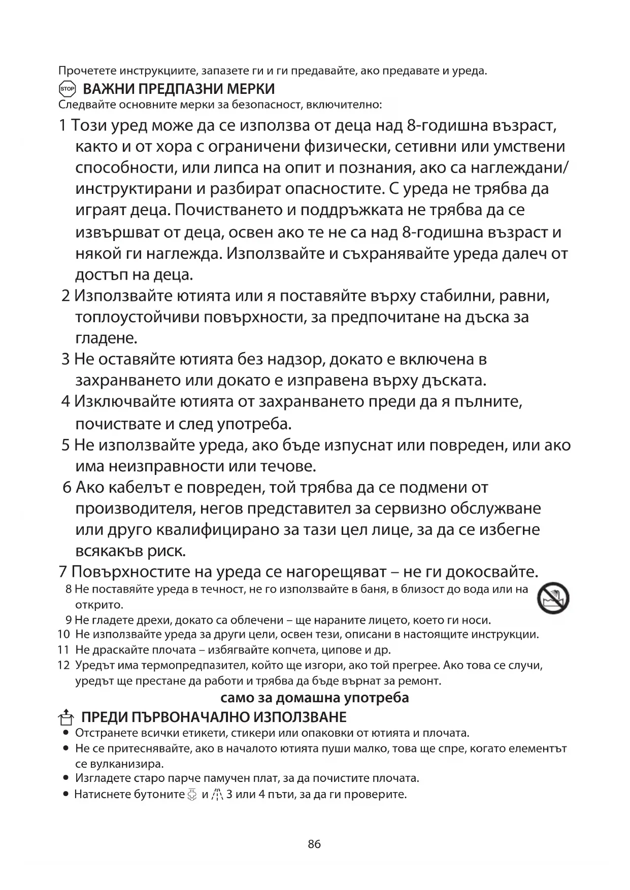 1 Този уред може да се използва от деца над 8-годишна възраст, както и от хора с ограничени физически, сетивни или умствени способности, или липса на опит и познания, ако са наглеждани/инструктирани и разбират опасностите. С уреда не трябва да играят деца. Почистването и поддръжката не трябва да се извършват от деца, освен ако те не са над 8-годишна възраст и някой ги наглежда. Използвайте и съхранявайте уреда далеч от достъп на деца.