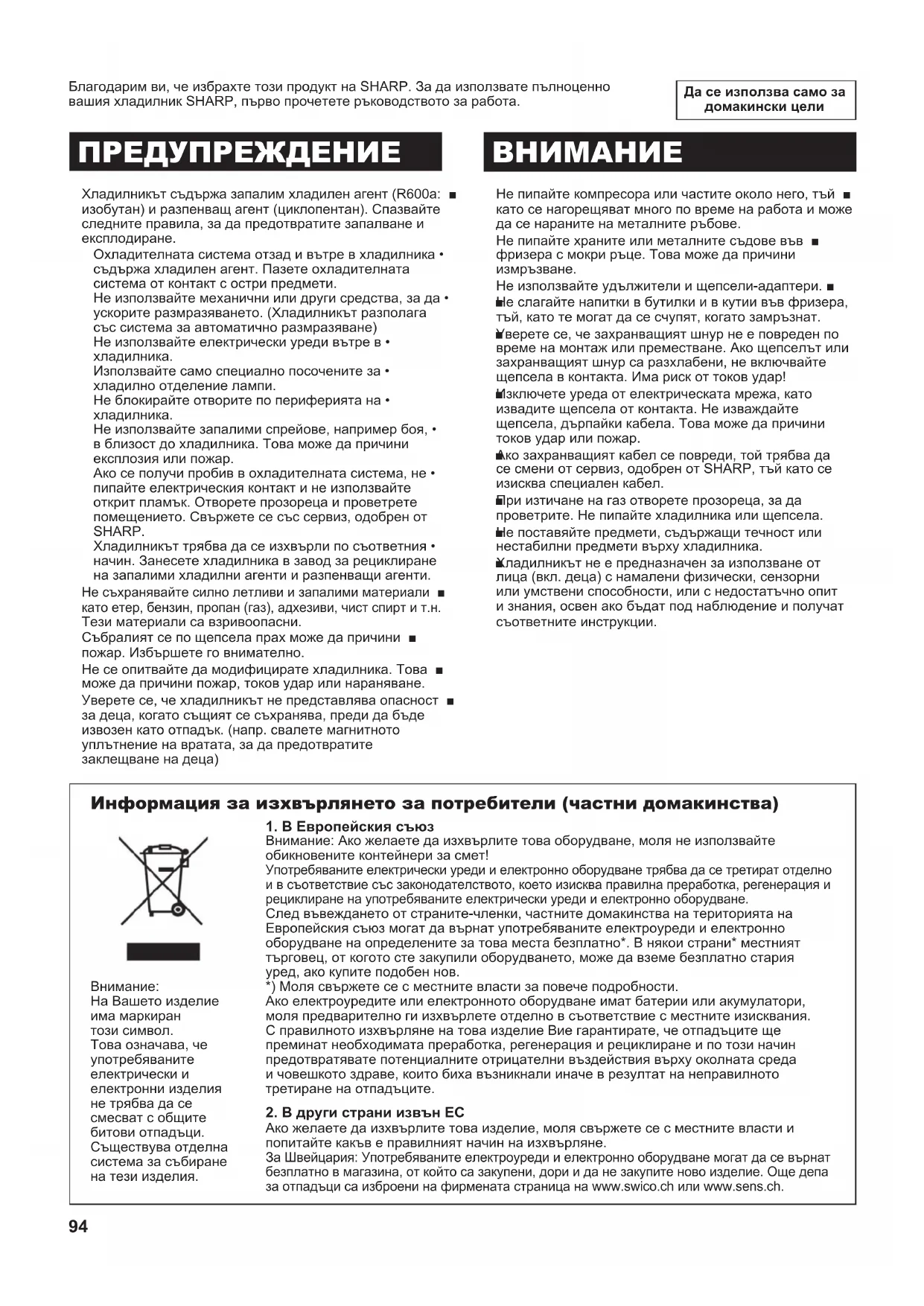 (B191)-East.indb 5 2011/03/14 17:00:4094 Да се използва само за домакински цели Благодарим ви, че избрахте този продукт на SHARP. За да използвате пълноценно вашия хладилник SHARP, първо прочетете ръководството за работа. Хладилникът съдържа запалим хладилен агент (R600a: ■ изобутан) и разпенващ агент (циклопентан). Спазвайте следните правила, за да предотвратите запалване и експлодиране. Охладителната система отзад и вътре в хладилника • съдържа хладилен агент. Пазете охладителната система от контакт с остри предмети. Не използвайте механични или други средства, за да • ускорите размразяването. (Хладилникът разполага със система за автоматично размразяване) Не използвайте електрически уреди вътре в • хладилника. Използвайте само специално посочените за • хладилно отделение лампи. Не блокирайте отворите по периферията на • хладилника. Не използвайте запалими спрейове, например боя, • в близост до хладилника. Това може да причини експлозия или пожар. Ако се получи пробив в охладителната система, не • пипайте електрическия контакт и не използвайте открит пламък. Отворете прозореца и проветрете помещението. Свържете се със сервиз, одобрен от SHARP. Хладилникът трябва да се изхвърли по съответния • начин. Занесете хладилника в завод за рециклиране на запалими хладилни агенти и разпенващи агенти. Не съхранявайте силно летливи и запалими материали ■ като етер, бензин, пропан (газ), адхезиви, чист спирт и т.н. Тези материали са взривоопасни. Събралият се по щепсела прах може да причини ■ пожар. Избършете го внимателно. Не се опитвайте да модифицирате хладилника. Това ■ може да причини пожар, токов удар или нараняване. Уверете се, че хладилникът не представлява опасност ■ за деца, когато същият се съхранява, преди да бъде извозен като отпадък. (напр. свалете магнитното уплътнение на вратата, за да предотвратите заклещване на деца) ПРЕДУПРЕЖДЕНИЕ