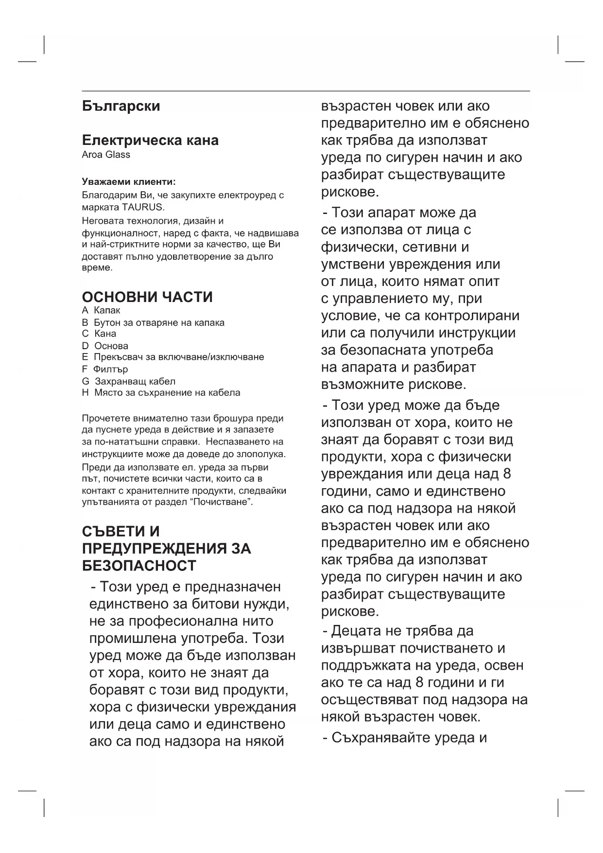 ОСНОВНИ ЧАСТИ A Капак B Бутон за отваряне на капака C Кана D Основа E Прекъсвач за включване/изключване F Филтър G Захранващ кабел H Място за съхранение на кабела Прочетете внимателно тази брошура преди да пуснете уреда в действие и я запазете за по-нататъшни справки. Неспазването на инструкциите може да доведе до злополука. Преди да използвате ел. уреда за първи път, почистете всички части, които са в контакт с хранителните продукти, следвайки упътванията от раздел “Почистване”.
