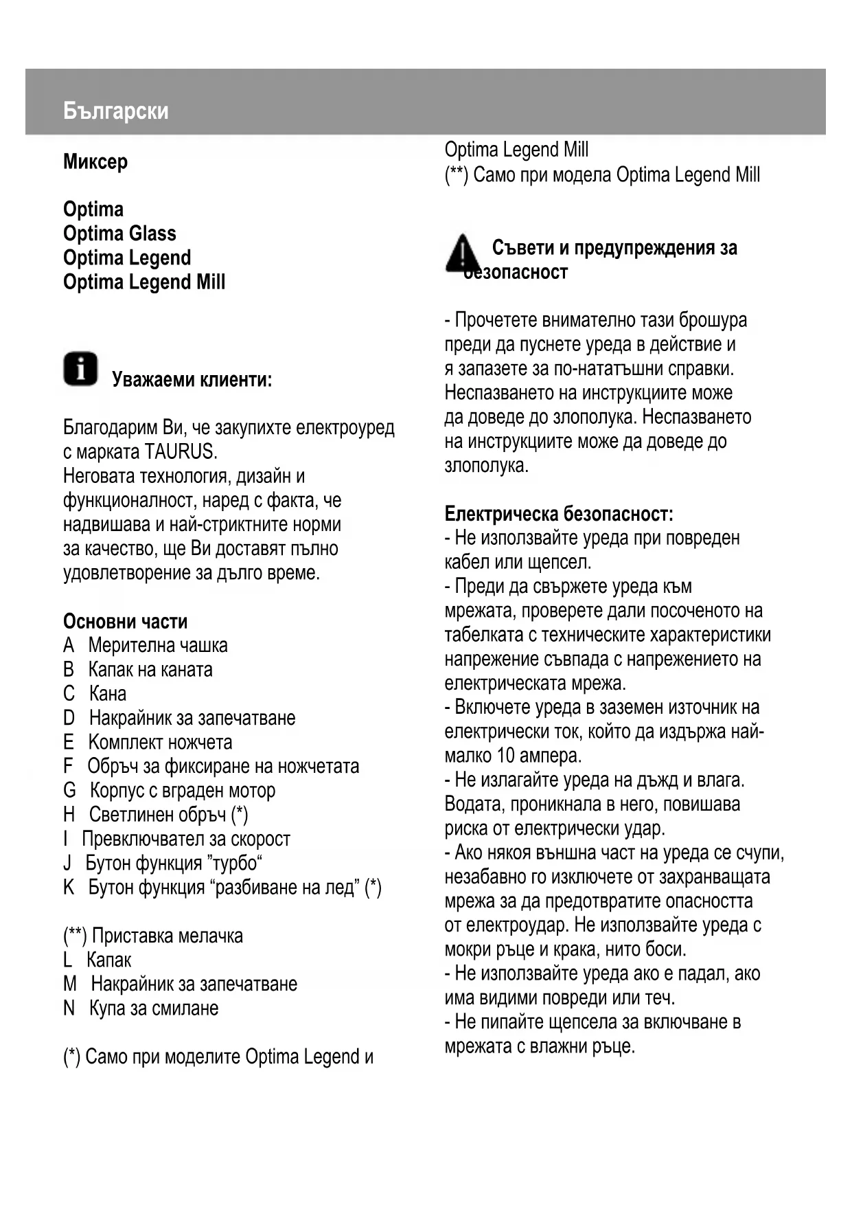 Optima Legend - Блендер TAURUS - Notice d'utilisation et mode d'emploi gratuit