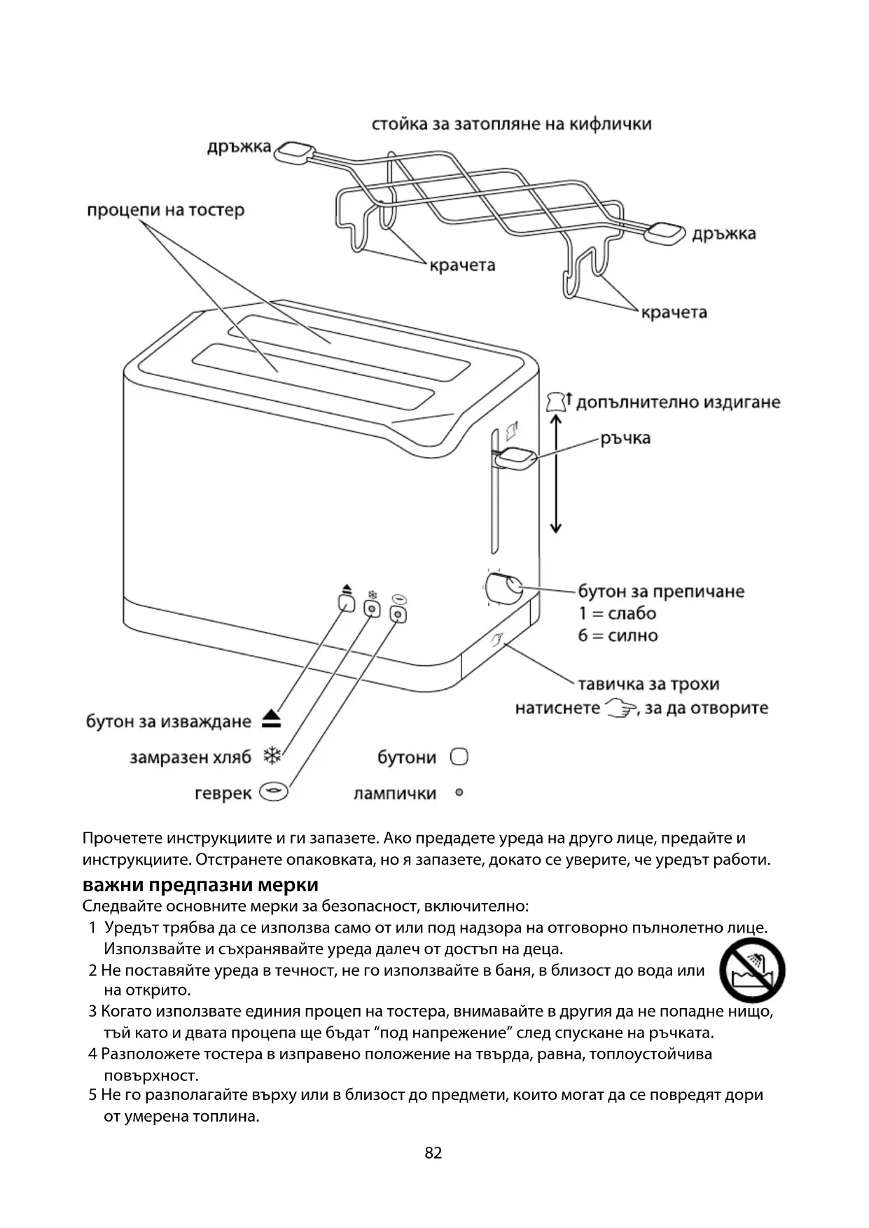9 Не покривайте уреда и не поставяйте нищо отгоре му. 10 Ако хлябът заседне в уреда, изключете уреда, оставете го да се охлади и внимателно извадете хляба. Не използвайте остри предмети, тъй като те могат да повредят нагревателите. 11 Не препичайте продукти, намазани с масло - те могат да се запалят. 12 Не използвайте надробени, извити филии или такива с неправилна форма, тъй като те могат да заседнат в тостера. 13 Изключете уреда от контакта, когато не го използвате, преди да го преместите, както и преди почистване. 14 Почиствайте трохите в тостера редовно, за да избегнете натрупването им, което е нехигиенично и може да породи риск от пожар. 15 Не използвайте тостера, преди тавичката за трохи да е правилно поставена и затворена. 16 Дръжте уреда и кабела на разстояние от котлони, готварски плочи или печки. 17 Не използвайте уреда за други цели, освен тези, описани в настоящите инструкции. 18 Този уред не трябва да се използва с външен таймер или система за дистанционно управление. 19 Не използвайте уреда, ако е повреден или не работи изрядно. 20 Ако кабелът е повреден, той трябва да се подмени от производителя, негов представител за сервизно обслужване или друго квалифицирано за тази цел лице, за да се избегне всякакъв риск. само за домашна употреба преди първоначално използване 1 Задайте максимална степен на препичане (6). 2 Задействайте уреда празен, за да обработите новите нагреватели. 3 Това може да предизвика миризма, но тя не трябва да Ви безпокои. Уверете се, че помещението е добре вентилирано. препичане на хляб 4 Разположете тостера в изправено положение на твърда, равна, топлоустойчива повърхност. 5 Не го разполагайте върху или в близост до предмети, които могат да се повредят дори от умерена топлина. 6 Хлябът може да се запали. Затова не използвайте уреда в близост до или под завеси или други запалими материали и не го оставяйте без наблюдение, докато е горещ. 7 Включете щепсела в захранващия контакт. 8 Настройте бутона за препичане на необходимото ниво (1 = слабо, 6 = силно). 9 Поставете филията в процепа на тостера (максимална дебелина 25 mm). 10 Натиснете ръчката надолу до крайна степен. , Тя ще се застопори в долна позиция, само ако тостерът е включен в електрическата