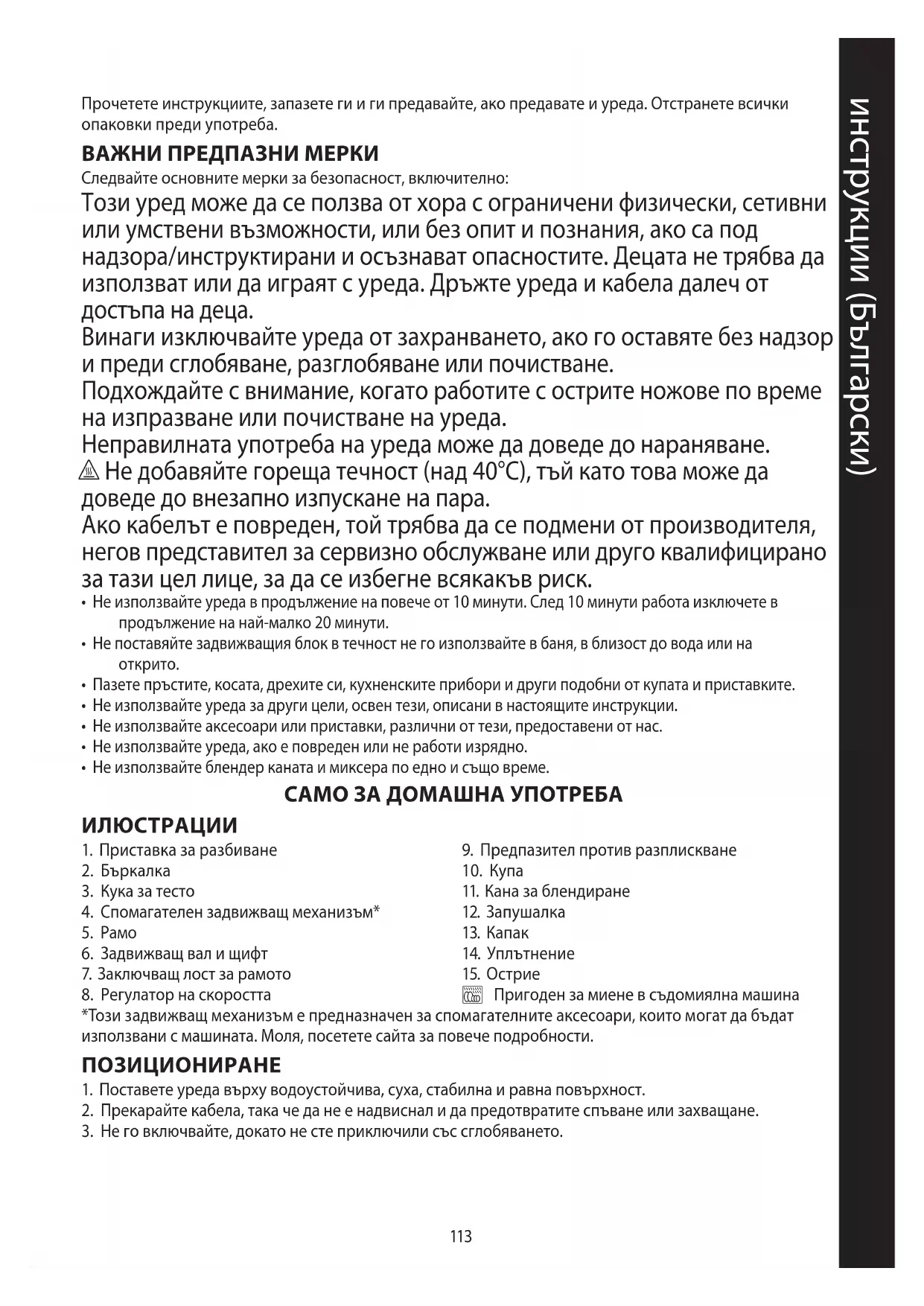 • Пазете пръстите, косата, дрехите си, кухненските прибори и други подобни от купата и приставките.