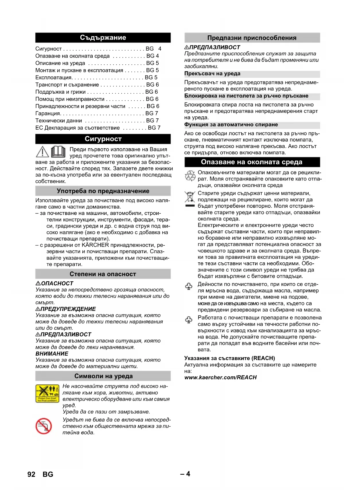 93 dB(A) Pridržano pravo na tehničke promene. Izjava o usklađenosti sa propisima EU Proizvod: Uređaj za čišćenje pod visokim pritiskom Tip: 1.673-xxx Odgovarajuće EU-direktive: 2011/65/EU 2000/14/EZ 2006/42/EZ (+2009/127/EZ) 2014/30/EU Primenjene usklađene norme: EN 60335–1 EN 60335–2–79 EN 62233: 2008 EN 55014–1:2017 EN 55014–2: 2015 EN 61000–3–2: 2014 EN 61000–3–3: 2013 EN IEC 63000: 2018 Primenjeni postupak ocenjivanja usklađenosti: 2000/14/EZ: Prilog V Nivo jačine zvuka dB(A) Izmerena: 90 Zagarantovana: 93 Chairman of the Board of Management Director Regulatory Affairs & Certification 91SR– 4 Преди първото използване на Вашия уред прочетете това оригинално упът- ване за работа и приложените указания за безопас- ност. Действайте според тях. Запазете двете книжки за по-късна употреба или за евентуален последващ собственик. Използвайте уреда за почистване под високо наля- гане само в частни домакинства. – за почистване на машини, автомобили, строи- телни конструкции, инструменти, фасади, тера- си, градински уреди и др. с водна струя под ви- соко налягане (ако е необходимо с добавка на почистващи препарати). – с разрешени от KÄRCHER принадлежности, ре- зервни части и почистващи препарати. Спаз- вайте указанията, приложени към почистващи- те препарати.