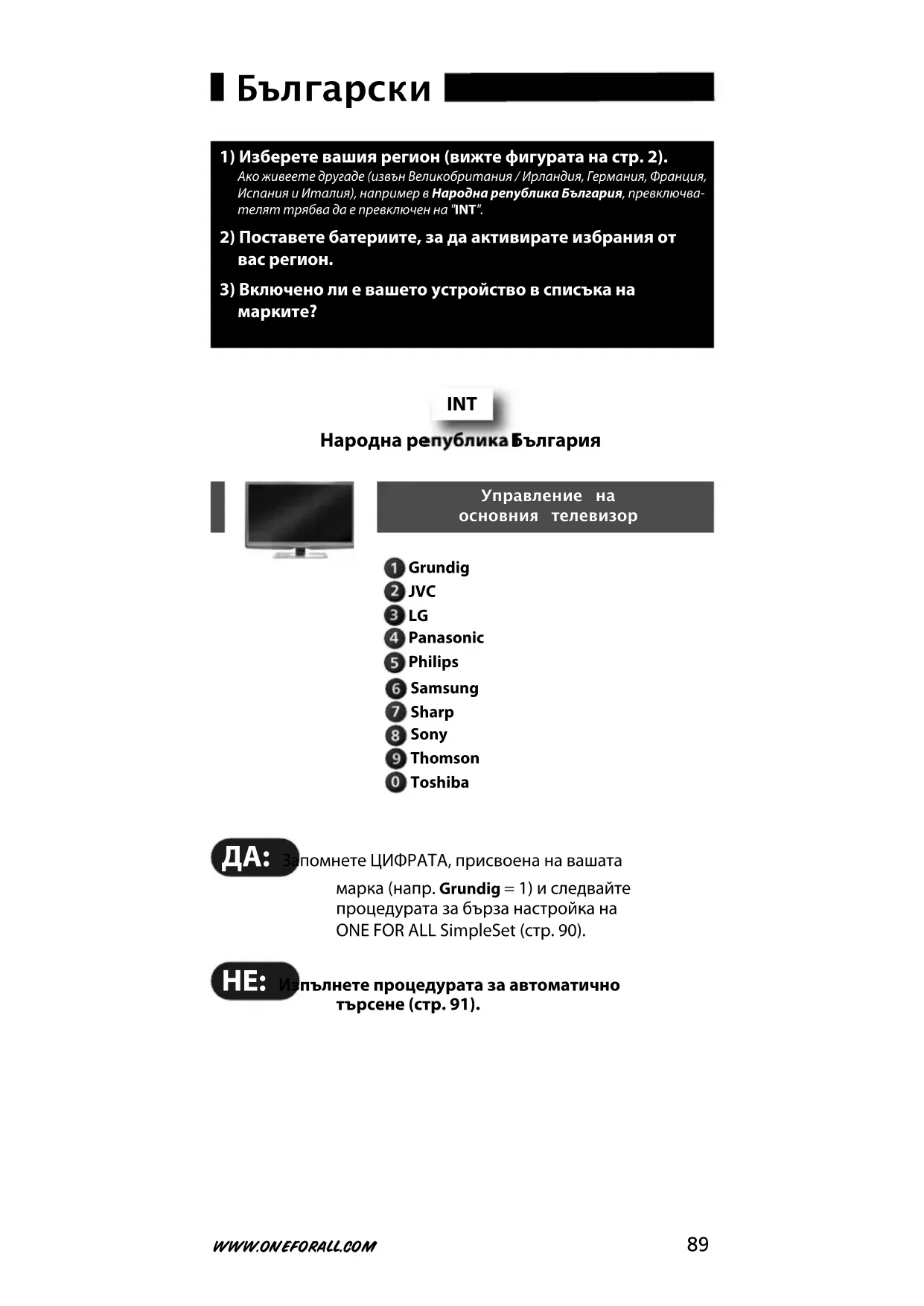 два пъти. Уверете се, че устройството ви евключено (ON, а не е в режим на готовност). Auto search (Автоматично търсене) Това е начинът за настройка на всички марки, които не са обхванати отSimpleSet