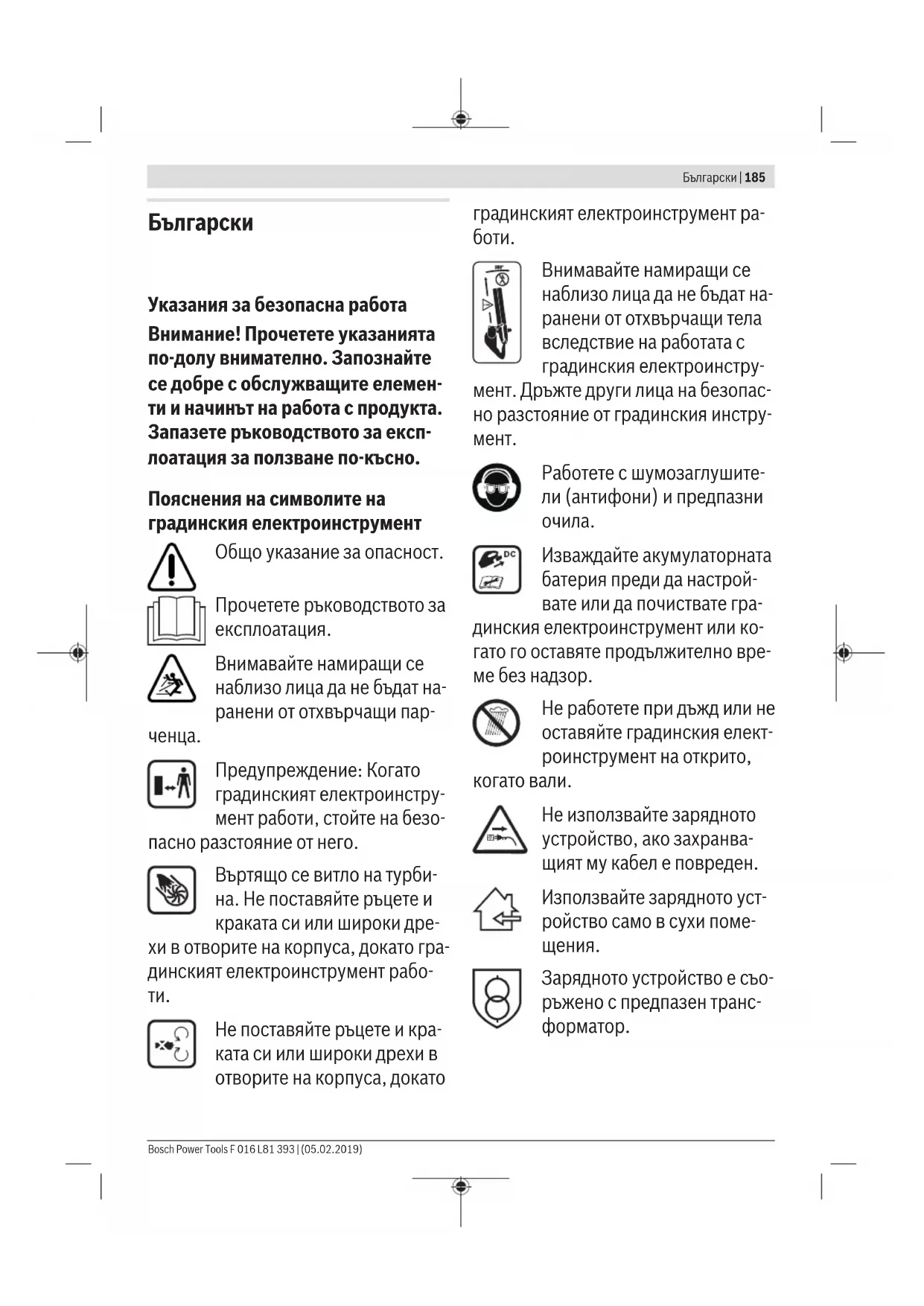 u Внимавайте да не предизвикате късо съединение между клемите на акумулаторната батерия. Същес- твува опасност от експлозия. u Периодично почиствайте вентилационните отвори на акумулаторната батерия с мека чиста и суха четка. Указания за безопасна работа със зарядни устройства Прочетете всички упътвания и указания за безопасна работа с машината. Неспаз- ването на указанията за безопасна работа и на упътванията може да предизвика токов удар, пожар и/или тежки травми. Съхранявайте всички указания за безопасна работа и упътвания за ползване в бъдеще. Използвайте зарядното устройство само ако разбирате добре и можете да управлявате всичките му функции или сте получили нужните указания за това. u Не допускайте това зарядно уст- ройство да бъде ползвано от деца, лица с ограничени физически, сен- зорни или душевни способности или лица с недостатъчни познания и опит и/или лица, които не са за- познати с тези указания. Възможно е национални нормативни доку- менти да ограничават възрастта на работещия с градинския електро- инструмент. u Наблюдавайте деца. Така се га- рантира, че децата няма да играят със зарядното устройство. u Зареждайте само литиево-йонни акумулаторни батерии на Бош с ка- пацитет 1,3Ah (от 10акумулатор- ни клетки). Номиналното напреже- ние на акумулаторната батерия трябва да съответства на зарядно- то напрежение на зарядното уст- ройство. Не се опитвайте да зареж- дате обикновени (неакумулатор- ни) батерии. При зареждане на други акумулаторни батерии съ- ществува опасност от пожар и/или