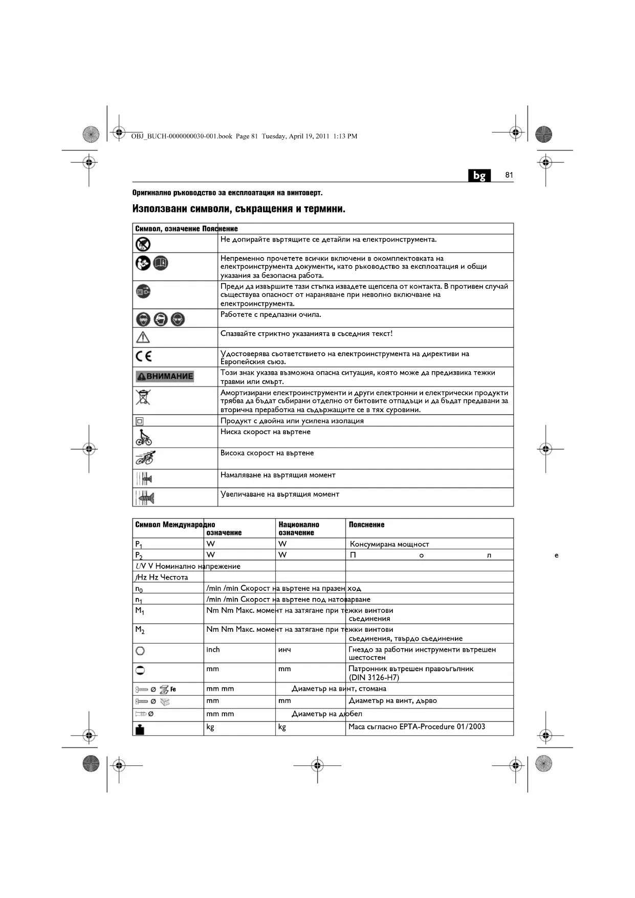 Оригинално ръководство за експлоатация на винтоверт. Използвани символи, съкращения и термини. Символ, означение Пояснение Не допирайте въртящите се детайли на електроинструмента. Непременно прочетете всички включени в окомплектовката на електроинструмента документи, като ръководство за експлоатация и общи указания за безопасна работа. Преди да извършите тази стъпка извадете щепсела от контакта. В противен случай съществува опасност от нараняване при неволно включване на електроинструмента. Работете с предпазни очила. Спазвайте стриктно указанията в съседния текст! Удостоверява съответствието на електроинструмента на директиви на Европейския съюз. Този знак указва възможна опасна ситуация, която може да предизвика тежки травми или смърт. Амортизирани електроинструменти и други електронни и електрически продукти трябва да бъдат събирани отделно от битовите отпадъци и да бъдат предавани за вторична преработка на съдържащите се в тях суровини. Продукт с двойна или усилена изолация Ниска скорост на въртене Висока скорост на въртене Намаляване на въртящия момент Увеличаване на въртящия момент Символ Международно