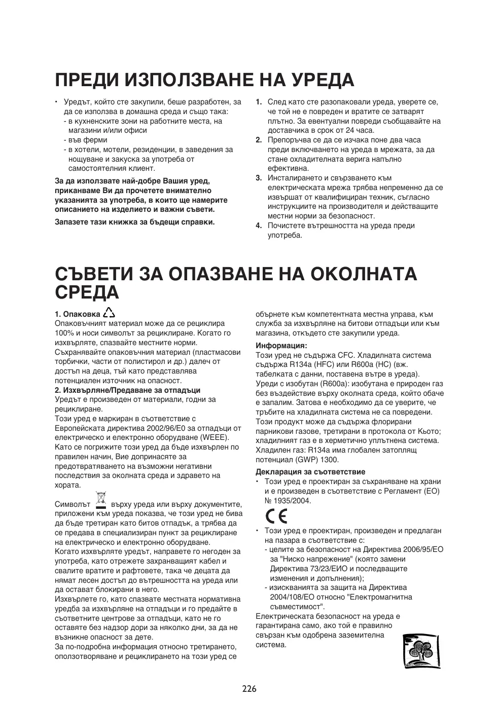 Informations : Cet appareil est sans CFC. Le circuit réfrigérant contient du R134a (HFC) ou du R600a (HC). Pour en savoir plus, consultez la plaquette signalétique située à l'intérieur de l'appareil. Pour les appareils à isobutane (R600a) : l'isobutane est un gaz naturel sans danger pour l'environnement, mais inflammable. Assurez-vous par conséquent que les tuyaux du circuit réfrigérant sont en parfait état. Ce produit peut contenir des gaz à effet de serre fluorés visés par le protocole de Kyoto ; le gaz réfrigérant est contenu à l'intérieur d'un circuit hermétique. Gaz réfrigérant : le R134a a un potentiel de réchauffement global (GWP) de 1300. Déclaration de conformité • Cet appareil est destiné à la conservation de produits alimentaires et est fabriqué conformément à la réglementation CE N° 1935/2004.