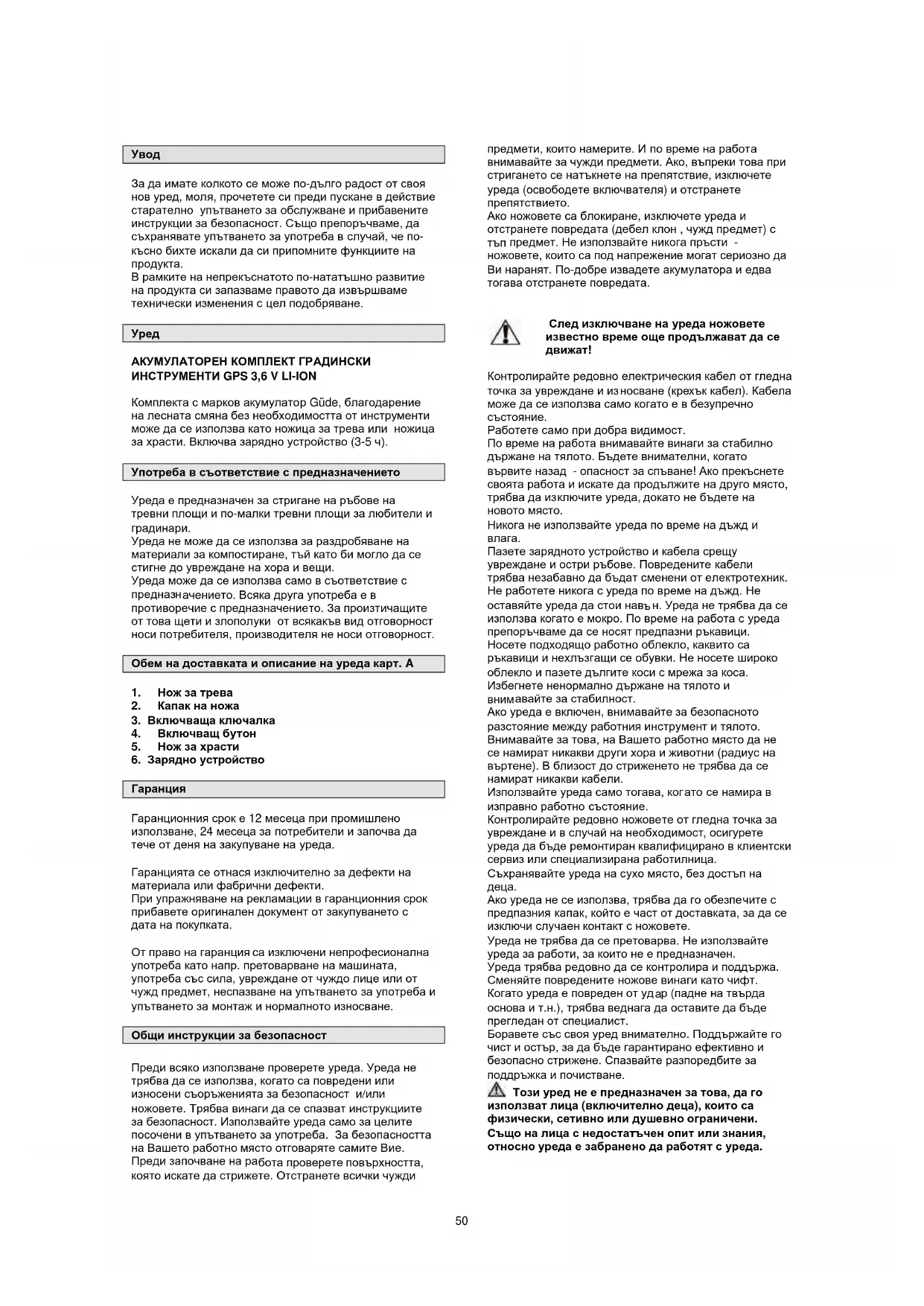 Използването на уреда изисква само съответно поучение от специалист, респ. от упътването за обслужване . Специално обучение не е необходимо. Технически данни Акумулатор: 3,6 V / 1,3 Ah ( Li-Ion ) Зарядно устройство: 3-5 ч. Широчина на захващане на ножиците за трева: 80 мм Дължина на захващане на ножиците за жив плет: 115 мм / макс. диаметър 8 мм Време на работа на акумулатора: прибл. 50 мин. Шум: L