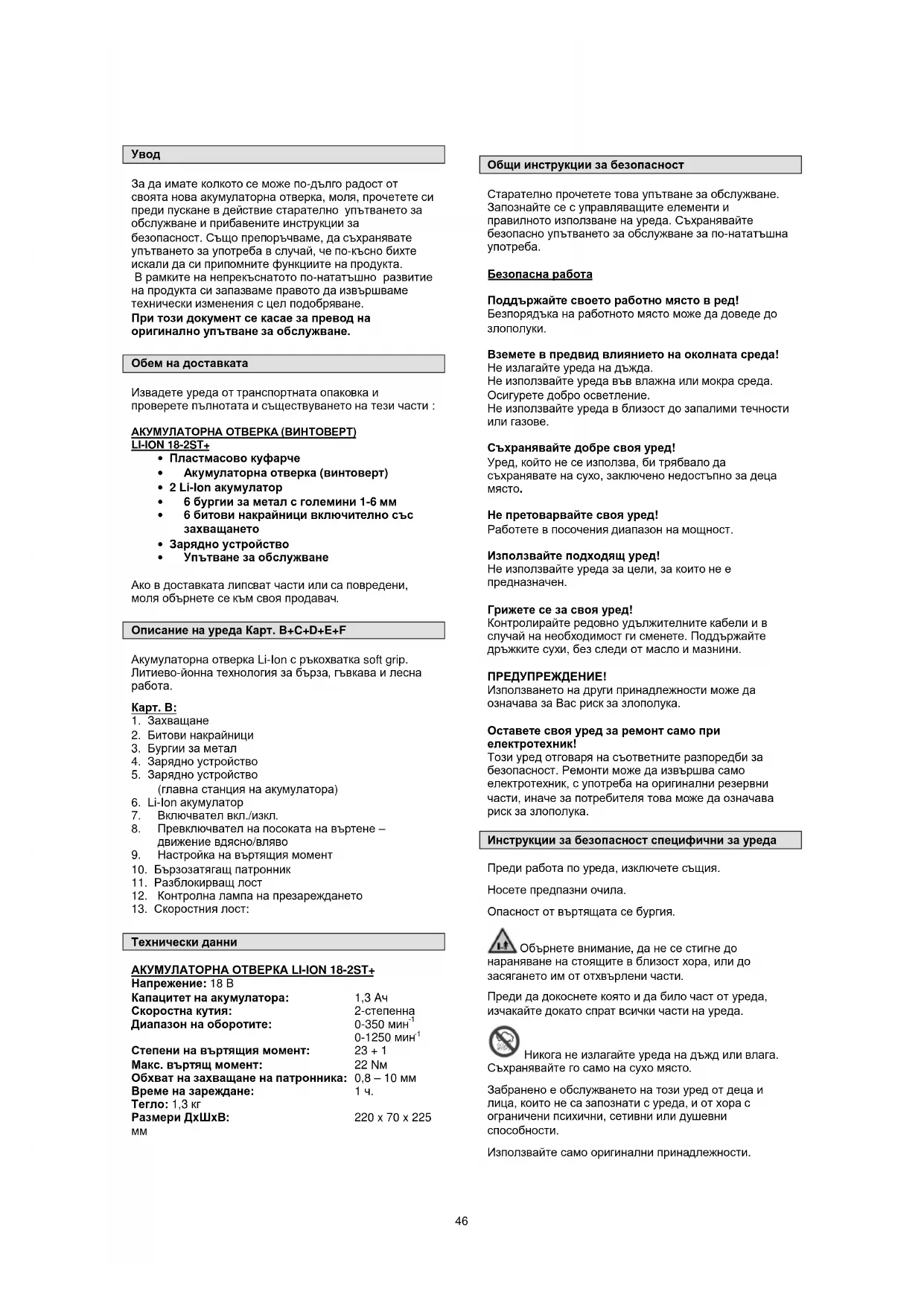 - Упътване за обслужване Ако в доставката липсват части или са повредени, моля обърнете се към своя продавач. Описание на уреда Карт. B+C+D+E+F Акумулаторна отверка Li-Ion с ръкохватка soft grip. Литиево-йонна технология за бърза, гъвкава и лесна