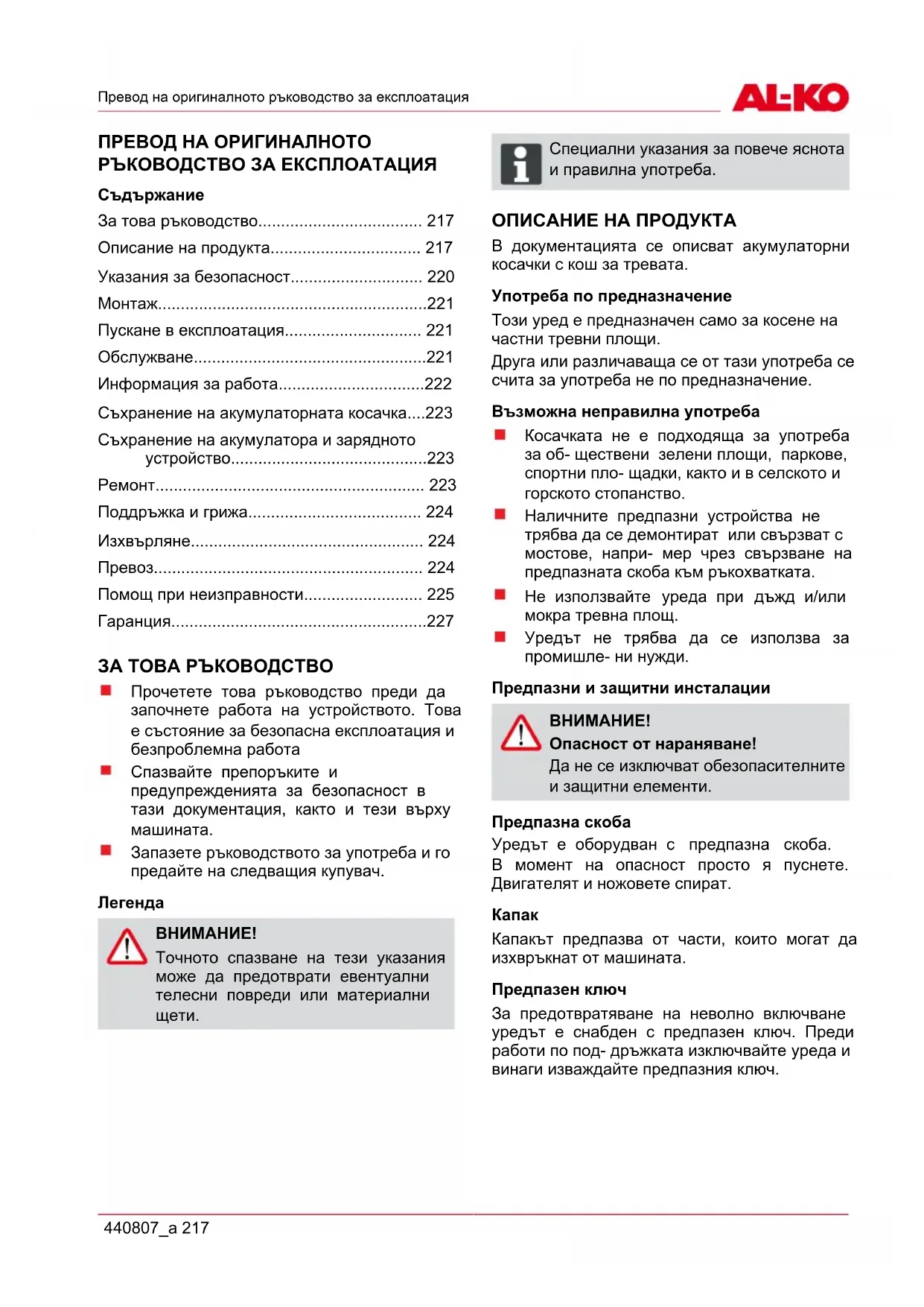 Téléchargez la notice de votre косачка за трева au format PDF gratuitement ! Retrouvez votre notice Comfort 38.4 Li - AL-KO et reprennez votre appareil électronique en main. Sur cette page sont publiés tous les documents nécessaires à l'utilisation de votre appareil Comfort 38.4 Li de la marque AL-KO.