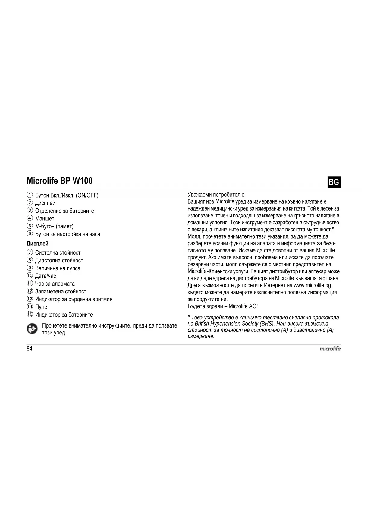РЪКОВОДСТВО ЗА ПОТРЕБИТЕЛЯ BP W100 MICROLIFE