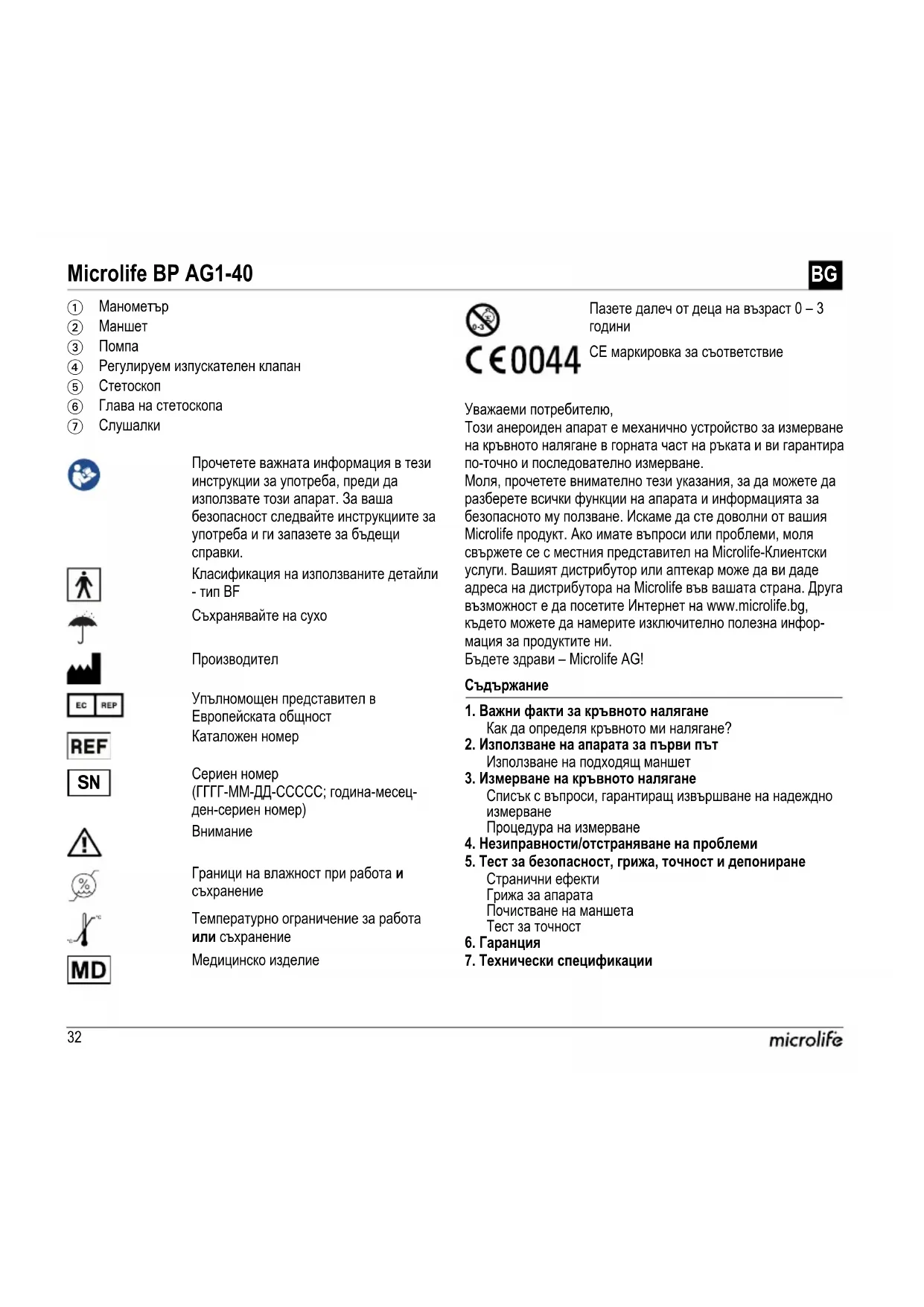 Редовни проверки и поддръжка (калибриране). Аксесоари и износващи се части: Тръба(и), помпа, маншет. Ако се изисква гаранционно обслужване, моля, свържете се с дилъра, от който е закупен продуктът, или с местния предста- вител на Microlife. Можете да се свържете с местния предста- вител на Microlife чрез нашия уебсайт: www.microlife.com/support Не позволявайте на деца да използват прибора без родителски контрол; някои части са достатъчно малки, за да бъдат погълнати. Бъдете наясно с риска от задушаване в случай, че това устройство е снабдено с кабели или тръби. Противопоказания Внимание: Не почиствайте маншета в пералня или съдомиялна машина.37Microlife BP AG1-40