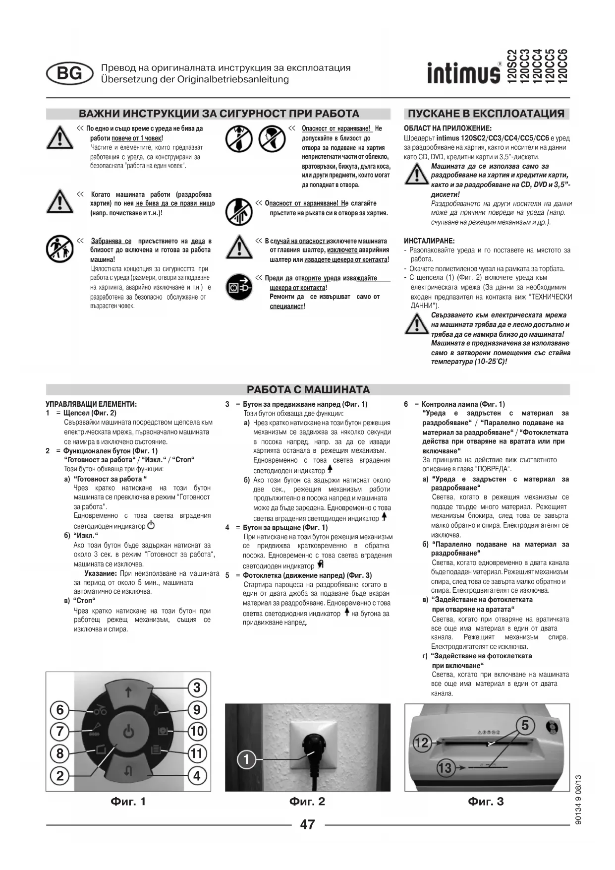 РАБОТА С МАШИНАТА Фиг. 1 Фиг. 3 Фиг. 4 Превод на оригиналната инструкция за експлоатацияÜbersetzung der OriginalbetriebsanleitungЗАДРЪСТВАНЕ НА УРЕДА С РАЗДРОБЕН МАТЕРИАЛ:(функция Auto-Reverse)Ако в следствие подаването на твърде много материал се получи задръстване, машината реагира по следния начин:- Режещият механизъм блокира, след това се завърта малко в обратна посока (материала се освобождава) и остава неподвижен. Електродвигателят се изключва. Контролната лампа (6) светва.Постъпва се така:Остатъци от хартия в джоба за подаване на хартията (12)- Отстранете върнатата хартия.- Режещият механизъм сега тръгва автоматично напред и раздробява хартиените остатъци застанали в режещия механизъм. По време на придвижването напред свети светодиодния индикатор на бутона за придвижване напред (3). Контролната лампа (6) изгасва.- Продължете раздробяването с по-малко количество хартия.Задръстване с раздробен материал в процепа за подаване на CD/DVD-та (13)- Отстранете върнатия материал.Внимателно премахнете материала, внимавайки да не се нараните от острите режещи части!- Останалия материал за раздробяване автоматично се подава на режещия механизъм и се раздробява. По време на придвижването напред свети светодиодния индикатор на бутона за придвижване напред (3). Контролната лампа (6) изгасва. - Когато материала за раздробяване премине, продължете раздробяването в правилния обем. - Ако е необходимо, превключвайте ръчно режещия механизъм на движение напред и назад, докато материала за раздробяване премине и бъде раздробен напълно.ПАРАЛЕЛНО ПОДАВАНЕ НА МАТЕРИАЛ ЗА РАЗДРОБЯВАНЕ:Ако в двата процепа едновременно бъде подаден материал, машината реагира както следва:- Режещият механизъм блокира, след това се завърта малко в обратна посока (материала се освобождава) и остава неподвижен. Електродвигателят се изключва. Контролната лампа (6) светва.- Премахнете материала от един от процепите.- Натиснете за кратко бутона за предвижване напред (3). Материалът за раздробяване на другия процеп се подава на режещия механизъм и се раздробява. Контролната лампа (6) изгасва.ФОТОКЛЕТКАТА СЕ ЗАДЕЙСТВА ПРИ ОТВАРЯНЕ НА ВРАТАТА:Ако при отваряне на вратичката в един от двата процепа все още има материал, електродвигателя се изключва и режещия механизъм спира. Контролната лампа (6) светва.Затворете вратичката и потвърдете състоянието с кратко натискане на бутона за придвижване напред (3). Наличният материал за раздробяване се подава на режещия механизъм и се раздробява.ФОТОКЛЕТКАТА СЕ ЗАДЕЙСТВА ПРИ ВКЛЮЧВАНЕ:Ако при включване в един от двата процепа все още има материал, светва контролната лампа (6).Премахнете материала и потвърдете състоянието с кратко натискане на бутона за придвижване напред (3).ЗАЩИТА НА ЕЛЕКТРОДВИГАТЕЛЯ:Ако електродвигателя се претовари, той се самоизключва. Контролната лампа (9) светва.След време на охлаждане от ок. 25-40 минути (според модела и температурата на помещението), може отново да включите уреда.ЕЛЕКТРИЧЕСКА ПОВРЕДА:Ако мига контролната лампа (9) заедно със светодиодния индикатор на функционалния бутон (2) или контролната лампа (8) има електрическа повреда. Машината не може да бъде включена.В този случай, моля уведомете Вашия търговец.КОНТРОЛЕН ЛИСТ ПРИ ПОВРЕДИ:Ако уреда не работи, проверете следните точки:- включен ли е щепсела в контакта?- затворена ли е вратичката?-