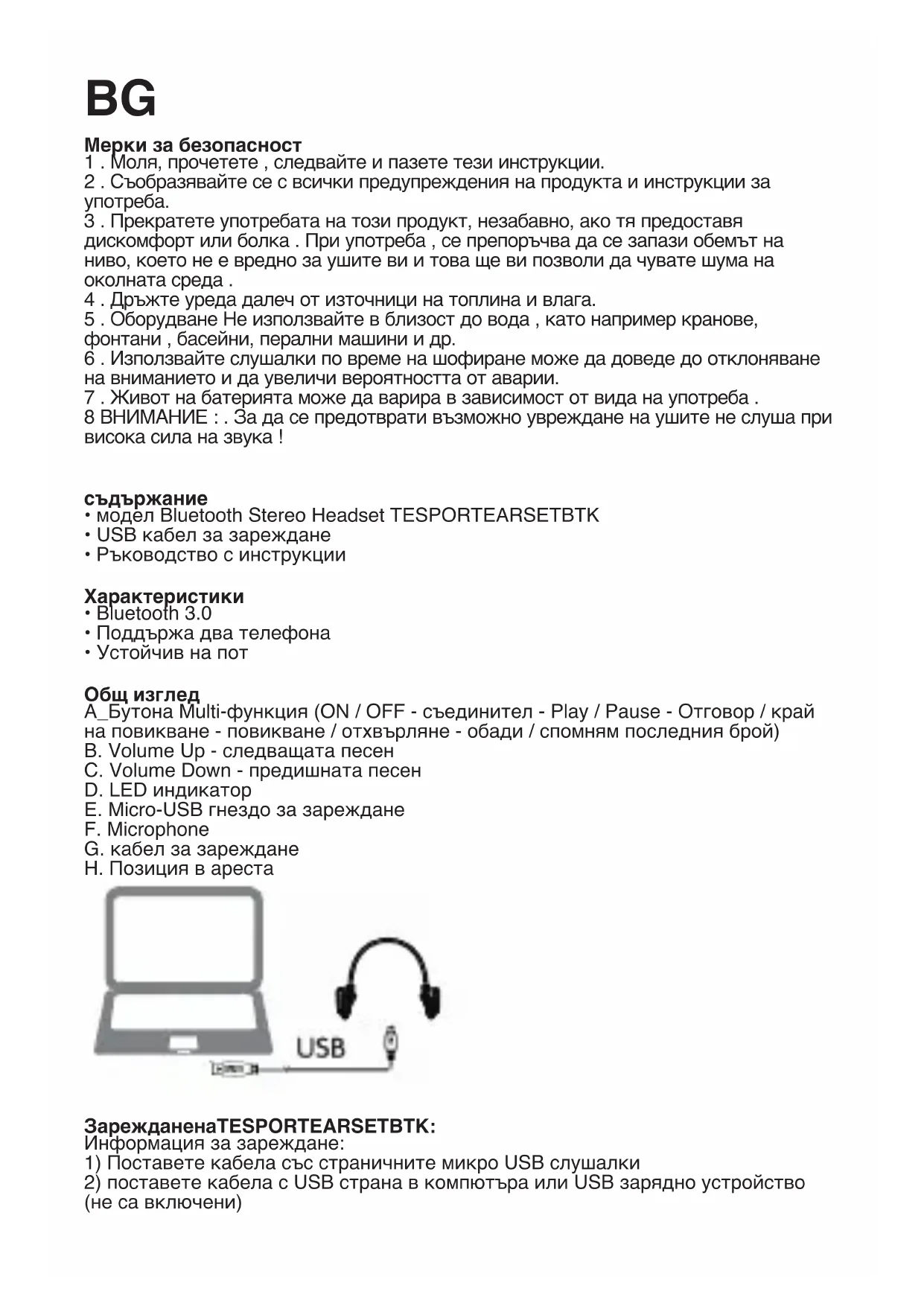A_Бутона Multi-функция (ON / OFF - съединител - Play / Pause - Отговор / край на повикване - повикване / отхвърляне - обади / спомням последния брой) B. Volume Up - следващата песен C. Volume Down - предишната песен D. LED индикатор E. Micro-USB гнездо за зареждане F. Microphone G. кабел за зареждане H. Позиция в ареста Charging the TESPORTEARSETBTK ЗарежданенаTESPORTEARSETBTK: Информация за зареждане: