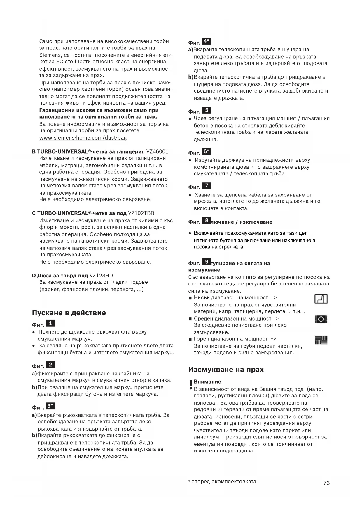 A hálózati csatlakozóaljzatot legalább 16 A-es biztosí- t éknak kell védenie.Ha a biztosíték a készülék bekapcsolásakor egyszerkioldana, annak az lehet az oka, hogy egyidejűlegmás nagy áramfelvételű elektromos készülék isugyanarra az áramkörre lett csatlakoztatva. A biztosíték kioldása elkerülhető, ha a készüléketbekapcsolás előtt a legalacsonyabb teljesítményfoko-zatra állítja, majd működés közben kapcsolja fokoza- t osan magasabb teljesítményfokozatra. Környezetvédelmi tudnivalók CsomagolásA csomagolás védi a porszívót a szállítás során kelet- k ező sérülésektől. A csomagolás környezetbarátanyagokból készült, és ezért újrafeldolgozásra alkal-mas. A továbbiakban már nem szükséges csomagoló-anyagot helyezze el a szelektív gyűjtőhelyek megfele-lő tárolóiban. Régi készülékA régi készülék még sok értékes anyagot tartalmaz.Ezért kiselejtezett készülékét adja le újrahasznosítás-ra kereskedőjénél vagy egy MÉH-telepen. Az aktuálisártalmatlanítási lehetőségekről érdeklődjön kereske-dőjénél vagy a helyi önkormányzatnál. A szűrő és a porzsák ártalmatlanításaA szűrő és a porzsák környezetet nem károsító anya-gokból készültek. Amennyiben nem tartalmaznakolyan anyagokat, melyeket tilos a háztartási hulladék-ba helyezni, a szokásos háztartási hulladékkal együttártalmatlaníthatja. Általános útmutatások TartozékokA tartozék (szívófej, szívócső stb.) kinézete azonosműködési mód esetén eltérhet a használati útmuta-tóban található ábráktól. Tudnivalók az energiacímkéhez Ez a porszívó egy általános rendeltetésű porszívó.Szőnyeg és kemény padló esetén a megadott energia-hatékonyság és takarításhatékonysági osztály elérésé-hez használja az átkapcsolható univerzális szívófejet.Az energiacímkén megadott értékek az előírt mérésimódszerek alapján (az EN60312-1 szerint) kerültekmegállapításra. bg Моля указанията за ползване да бъдат съхранявани.При предаване на прахосмукачката на трети лицамоля да бъдат предавани и указанията за ползване. Използване по предназначение Тази прахосмукачката е предвидена изключителносамо за ползване в домакинството, а не за профе-сионални цели. Използвайте прахосмукачката само всъответствие с данните на това указание за начина н а употреба. Производителят не носи отговорност заевентуални повреди, причинени от използване не попредназначение или неправилно обслужване.Поради това моля непременно съблюдавайте след-ните указания!Прахосмукачката може да работи само с:Оригинални резервни чaсти, консумативи или спе-циални принадлежности За да не се нарушава гаранцията, ние препоръчва-ме използване на Вашия уред само с оригиналниторбички за прах.За да се предотвратят наранявания и повреди,прахосмукачката не трябва да се използва за: Изсмукване на прах от хора или животни. Всмукване на:- малки живи същества (напр. мухи, паяци, ...).- вредни за здравето, горещи или горящи вещест-ва или предмети с остри ръбове.- влажни или течни вещества.- лесно запалими или експлозивни вещества игазове.- пепел, сажди от кахлени печки и инсталациитена централното парно отопление.- прах от тонер от принтери и копирни машини. Указания за безопасност