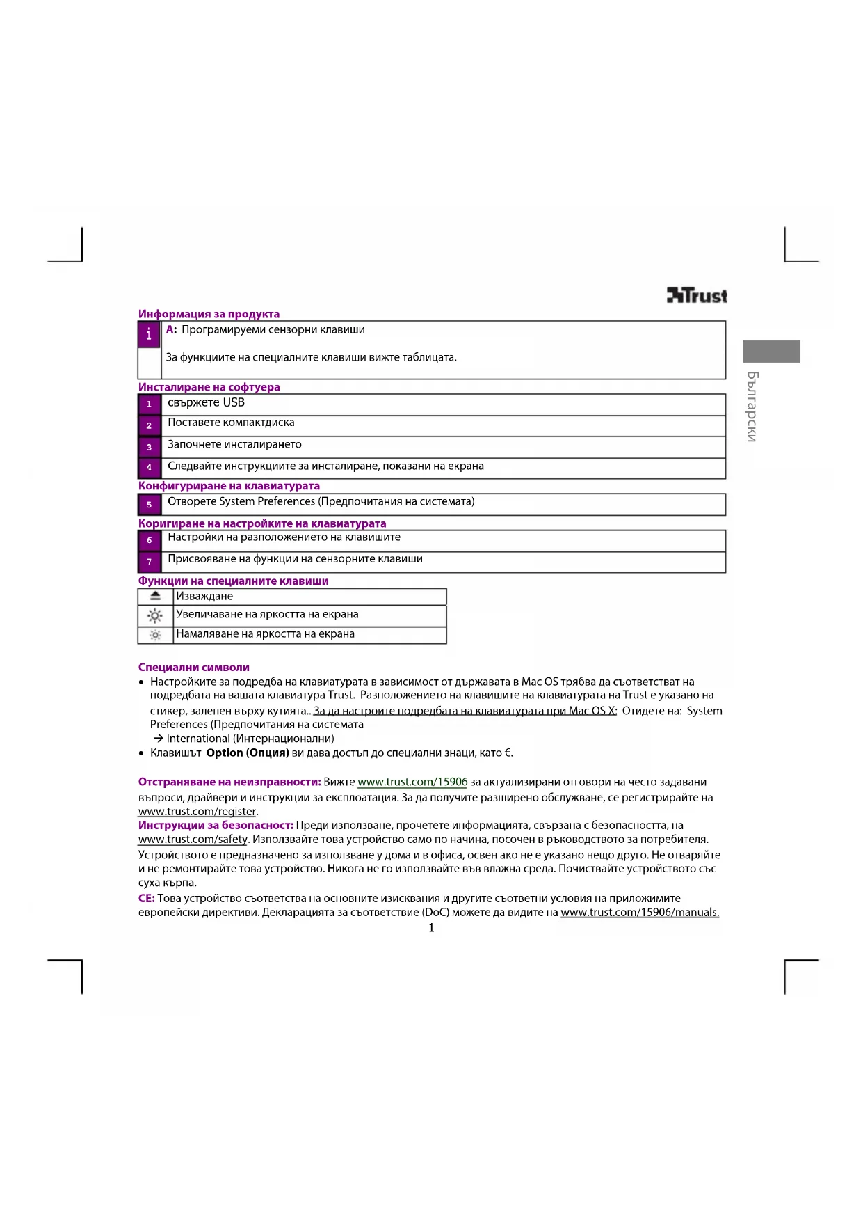 - Клавишът Option (Опция) ви дава достъп до специални знаци, като €. Отстраняване на неизправности: Вижте www.trust.com/15906 за актуализирани отговори на често задавани въпроси, драйвери и инструкции за експлоатация. За да получите разширено обслужване, се регистрирайте на www.trust.com/register. Инструкции за безопасност: Преди използване, прочетете информацията, свързана с безопасността, на www.trust.com/safety. Използвайте това устройство само по начина, посочен в ръководството за потребителя. Устройството е предназначено за използване у дома и в офиса, освен ако не е указано нещо друго. Не отваряйте и не ремонтирайте това устройство. Никога не го използвайте във влажна среда. Почиствайте устройството със суха кърпа. CE: Това устройство съответства на основните изисквания и другите съответни условия на приложимите европейски директиви. Декларацията за съответствие (DoC) можете да видите на www.trust.com/15906/manuals.
