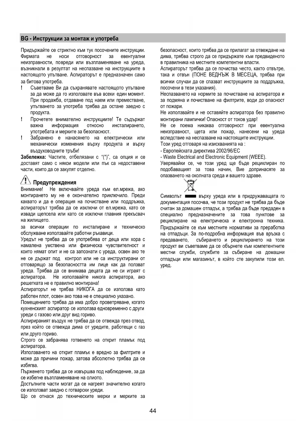 уреда. Трябва да се внимава децата да не си играят с аспиратора. Не използвайте никога аспиратора, ако решетката не е правилно монтирана! Аспираторът не трябва НИКОГА да се използва като работен плот, освен ако това не е специално указано. Помещението трябва да има добро проветряване, когато кухненският аспиратор се използва едновременно с други уреди с газово или друг вид гориво. Аспирираният въздух не трябва да се отвежда през отвод, през който се отвежда дима от уредите, работещи с газ или друго гориво. Строго се забранява готвенето на открит пламък под аспиратора. Използването на открит пламък е вредно за филтрите и може да причини пожар, затова абсолютно трябва да се