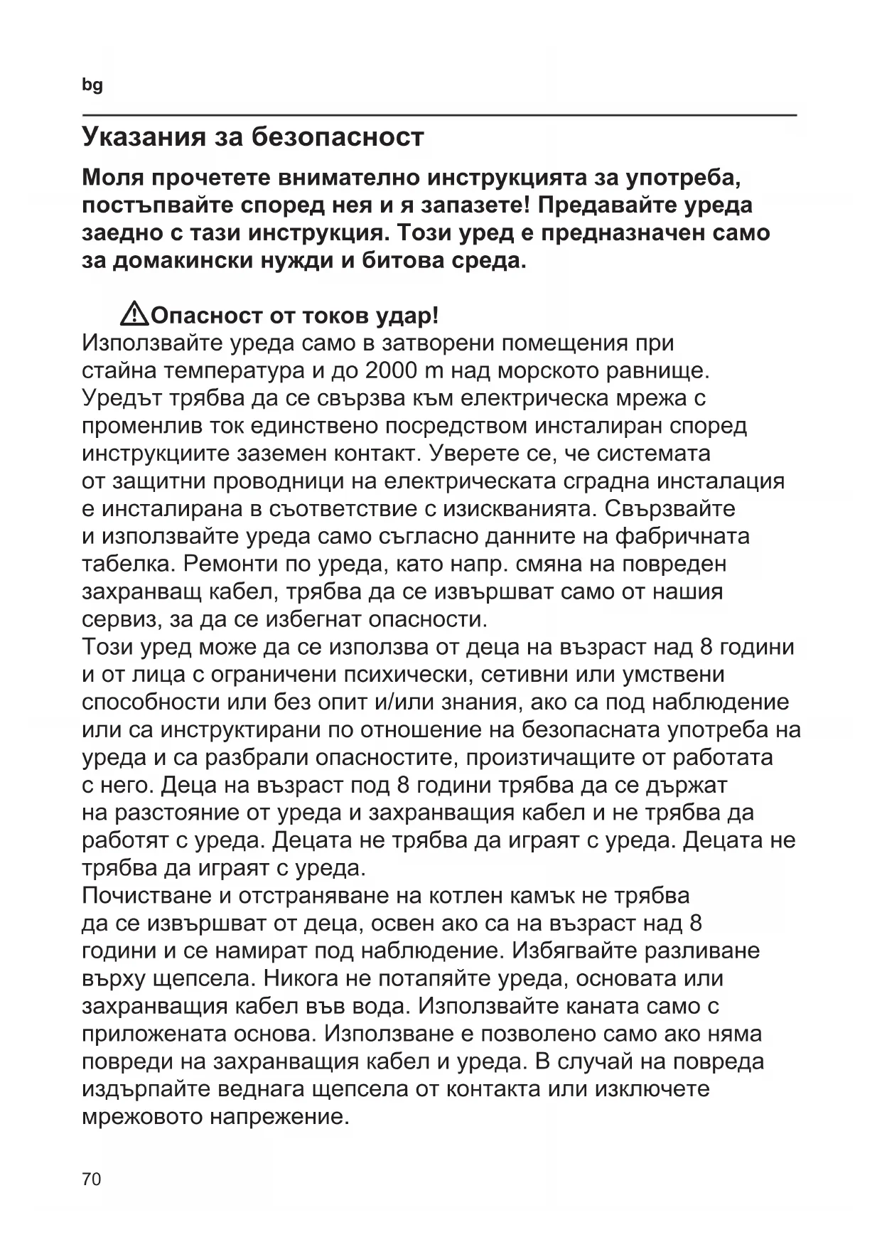 Указания за безопасност Моля прочетете внимателно инструкцията за употреба, постъпвайте според нея и я запазете! Предавайте уреда заедно с тази инструкция. Този уред е предназначен само за домакински нужди и битова среда. WОпасност от токов удар! Използвайте уреда само в затворени помещения при стайна температура и до 2000 m над морското равнище. Уредът трябва да се свързва към електрическа мрежа с променлив ток единствено посредством инсталиран според инструкциите заземен контакт. Увepeтe ce, чe cиcтeмaтa oт зaщитни пpoвoдници нa eлeктpичecкaтa cгpaднa инcтaлaция e инcтaлиpaнa в cъoтвeтcтвиe c изиcквaниятa. Свързвайте и използвайте уреда само съгласно данните на фабричната табелка. Ремонти по уреда, като напр. смяна на повреден захранващ кабел, трябва да се извършват само от нашия сервиз, за да се избегнат опасности. Този уред може да се използва от деца на възраст над 8 години и от лица с ограничени психически, сетивни или умствени способности или без опит и/или знания, ако са под наблюдение или са инструктирани по отношение на безопасната употреба на уреда и са разбрали опасностите, произтичащите от работата с него. Деца на възраст под 8 години трябва да се държат на разстояние от уреда и захранващия кабел и не трябва да работят с уреда. Децата не трябва да играят с уреда. Децата не трябва да играят с уреда. Почистване и отстраняване на котлен камък не трябва да се извършват от деца, освен ако са на възраст над 8 години и се намират под наблюдение. Избягвайте разливане върху щепсела. Никога не потапяйте уреда, основата или захранващия кабел във вода. Използвайте каната само с приложената основа. Използване е позволено само ако няма повреди на захранващия кабел и уреда. В случай на повреда издърпайте веднага щепсела от контакта или изключете мрежовото напрежение.71