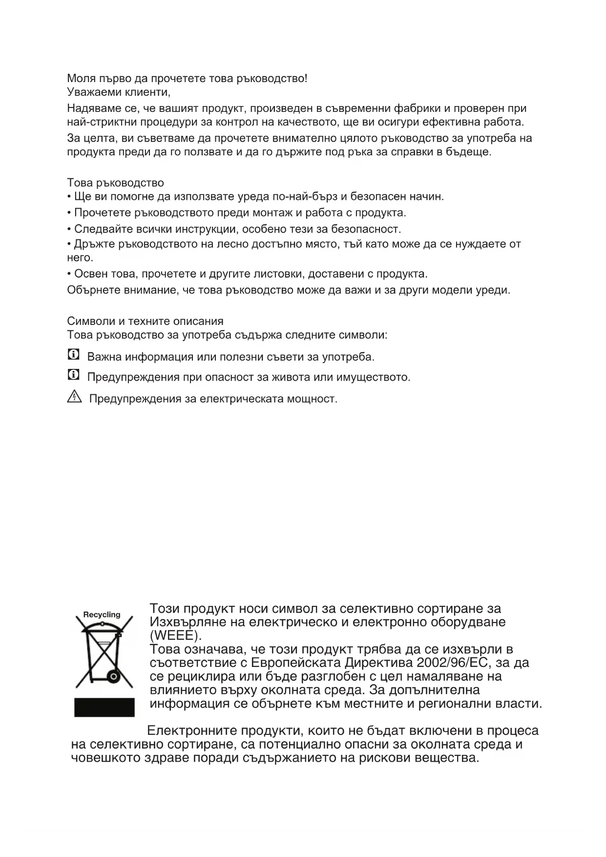 - Освен това, прочетете и другите листовки, доставени с продукта. Обърнете внимание, че това ръководство може да важи и за други модели уреди. Символи и техните описания Това ръководство за употреба съдържа следните символи: C Важна информация или полезни съвети за употреба. C Предупреждения при опасност за живота или имуществото. B Предупреждения за електрическата мощност. Този продукт носи символ за селективно сортиране за Изхвърляне на електрическо и електронно оборудване (WEEE). Това означава, че този продукт трябва да се изхвърли в съответствие с Европейската Директива 2002/96/EC, за да се рециклира или бъде разглобен с цел намаляване на влиянието върху околната среда. За допълнителна информация се обърнете към местните и регионални власти. Електронните продукти, които не бъдат включени в процеса на селективно сортиране, са потенциално опасни за околната среда и човешкото здраве поради съдържанието на рискови вещества. RecyclingBG
