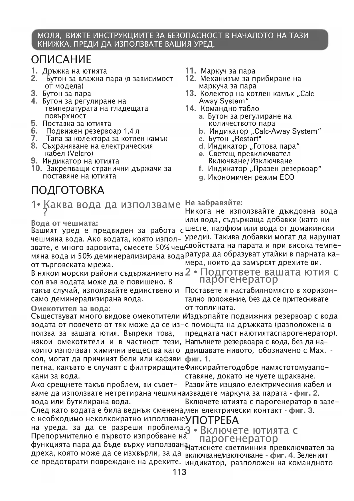 Уредът е дефектен. Не използвайте парогенератора и се обърнете към одобрен сервиз.Над корпуса излиза пара. Уредът е дефектен. Не използвайте парогенератора и се обърнете към одобрен сервиз.Индикаторът „Calc-AwaySystem“ светиНе сте натиснали бутон„Restart“ за рестартиране. Натиснете бутон „Restart“ за рестартиране,