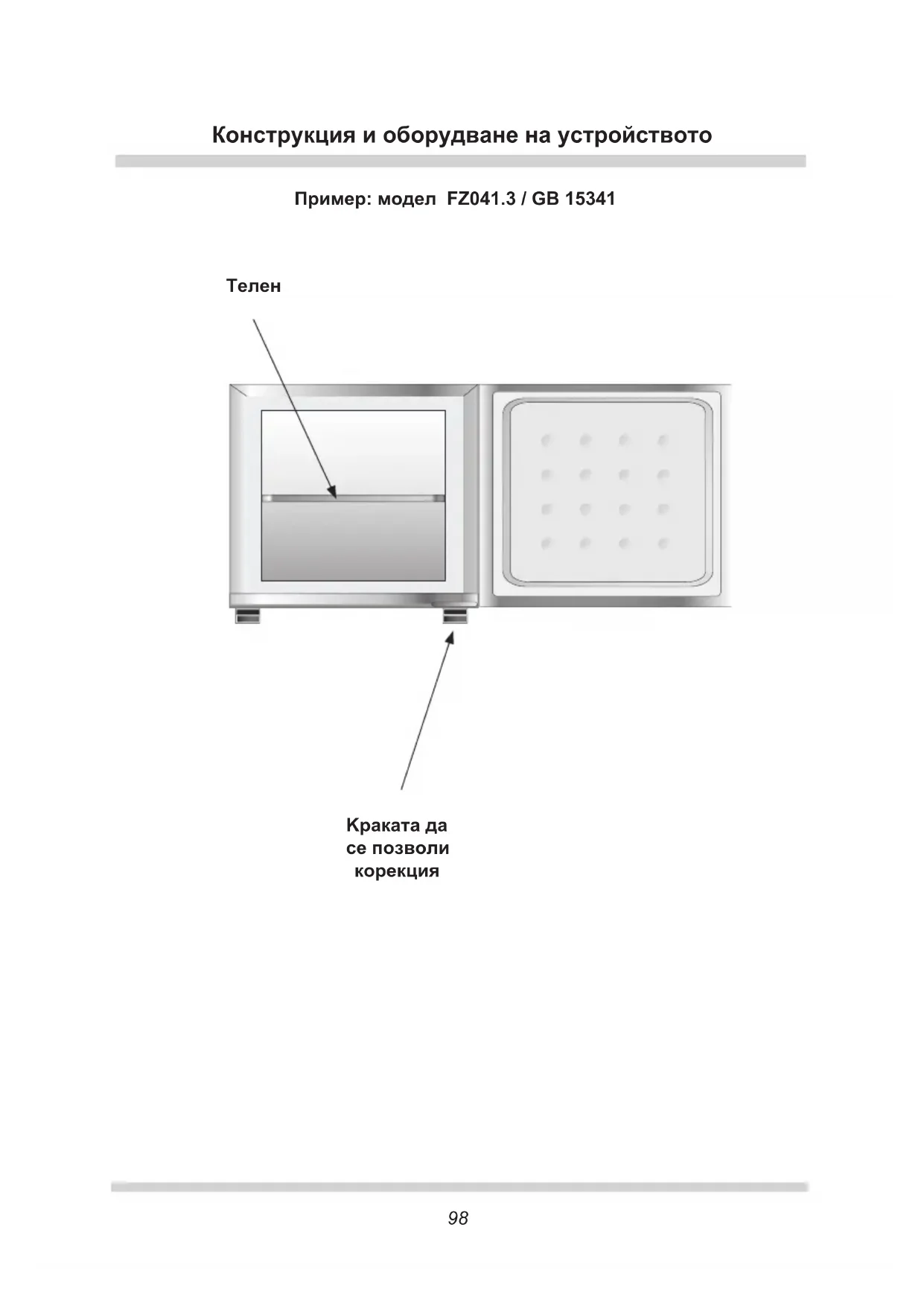 поставяне на изделие, съответно чрез монтаж на 2 регулирани предни крачета (фиг. 2). Задната стена на хладилника, а особено кондензаторът и други елементи на охладителната система, не бива да се докосват с други елементи, които могат да предизвикат повреда (предимно с тръба на ТЕЦ и водопроводната).