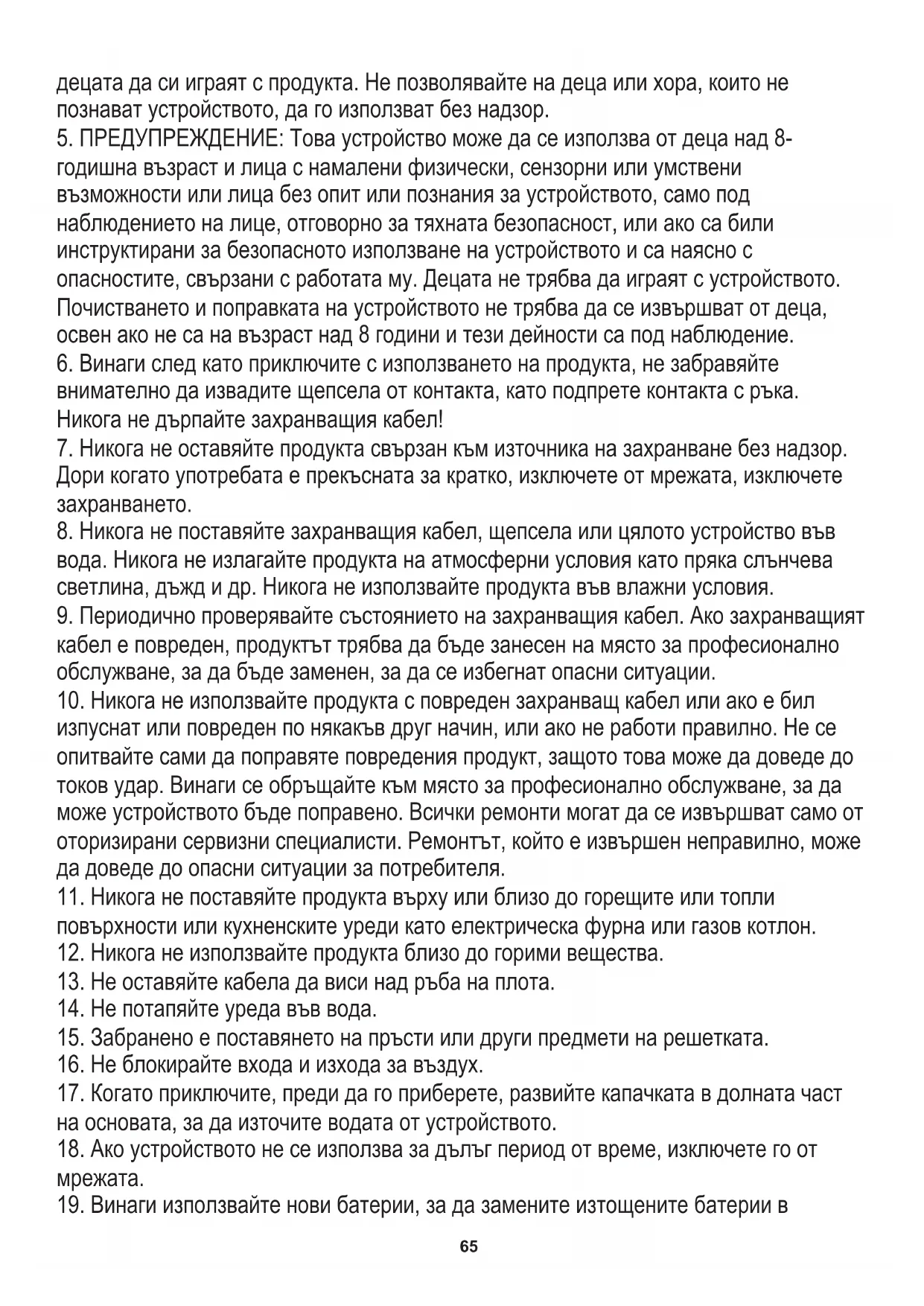 годишна възраст и лица с намалени физически, сензорни или умствени възможности или лица без опит или познания за устройството, само под наблюдението на лице, отговорно за тяхната безопасност, или ако са били инструктирани за безопасното използване на устройството и са наясно с опасностите, свързани с работата му. Децата не трябва да играят с устройството. Почистването и поправката на устройството не трябва да се извършват от деца, освен ако не са на възраст над 8 години и тези дейности са под наблюдение.