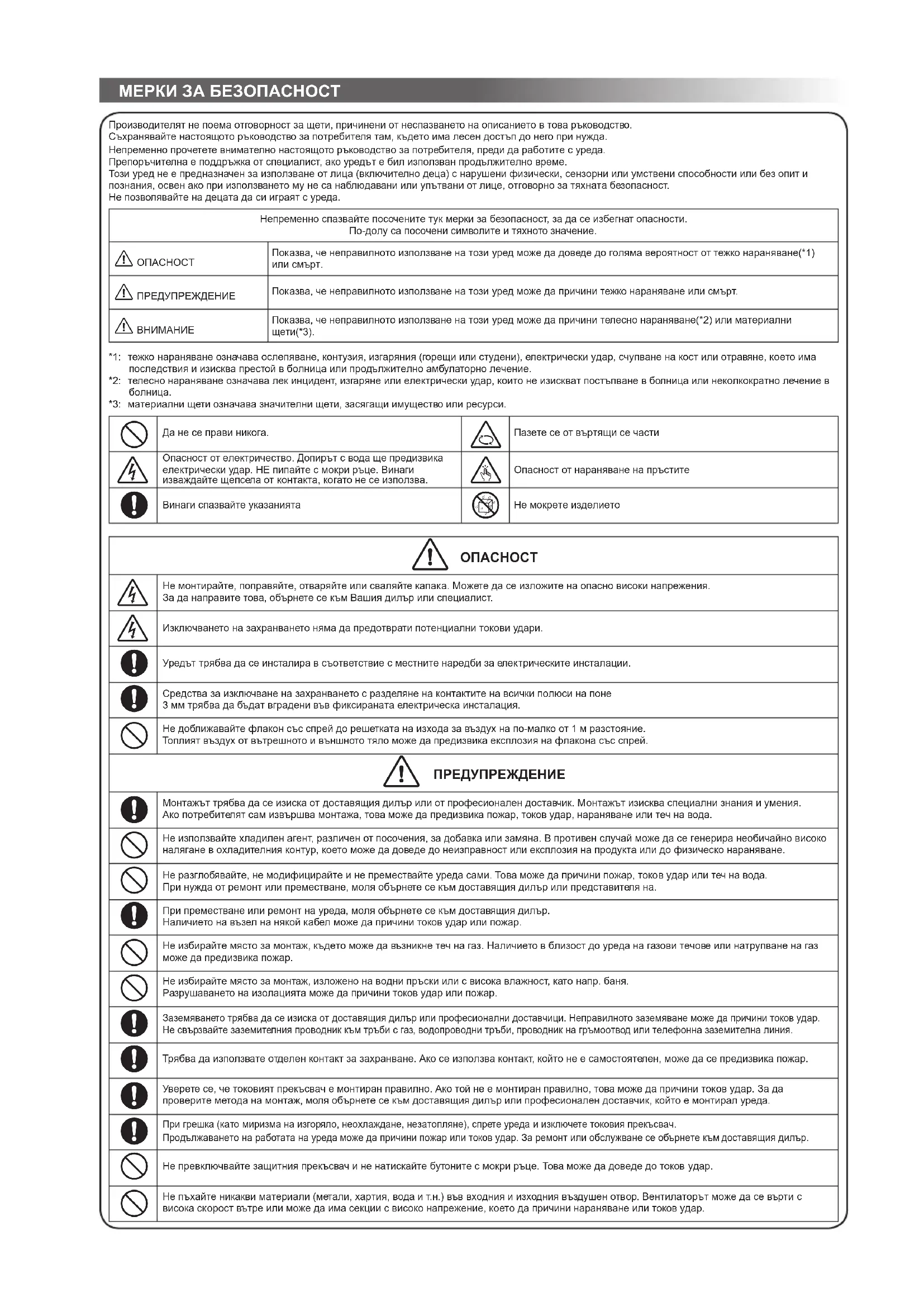sunete nu indică o defecţiune, deoarece pot fi cauzate de dilatarea / contractarea plasticului. Observaţie: Punctele 2-6 sunt valabile pentru modelele cu încălzire Condiţiile de funcţionare a aparatului de aer condiţionat Temp.FuncţionareTemperatură exterioară Temperatura încăperiiÎncălzire –15°C ~ 24°C Sub 28°CRăcire –10°C ~ 46°C 21°C ~ 32°C Dezumidifi care –10°C ~ 46°C 17°C ~ 32°C ROМЕРКИ ЗА БЕЗОПАСНОСТ Производителят не поема отговорност за щети, причинени от неспазването на описанието в това ръководство. Съхранявайте настоящото ръководство за потребителя там, където има лесен достъп до него при нужда. Непременно прочетете внимателно настоящото ръководство за потребителя, преди да работите с уреда. Препоръчителна е поддръжка от специалист, ако уредът е бил използван продължително време. Този уред не е предназначен за използване от лица (включително деца) с нарушени физически, сензорни или умствени способности или без опит и познания, освен ако при използването му не са наблюдавани или упътвани от лице, отговорно за тяхната безопасност. Не позволявайте на децата да си играят с уреда. Непременно спазвайте посочените тук мерки за безопасност, за да се избегнат опасности. По-долу са посочени символите и тяхното значение. 0 ОПАСНОСТ Показва, че неправилното използване на този уред може да доведе до голяма вероятност от тежко нараняване(*1) 0 ПРЕДУПРЕЖДЕНИЕ Показва, че неправилното използване на този уред може да причини тежко нараняване или смърт. 0 ВНИМАНИЕ Показва, че неправилното използване на този уред може да причини телесно нараняване(*2) или материални щети(*3). *1: тежко нараняване означава ослепяване, контузия, изгаряния (горещи или студени), електрически удар, счупване на кост или отравяне, което има последствия и изисква престой в болница или продължително амбулаторно лечение. *2: телесно нараняване означава лек инцидент, изгаряне или електрически удар, които не изискват постъпване в болница или неколкократно лечение в *3: материални щети означава значителни щети, засягащи имущество или ресурси.