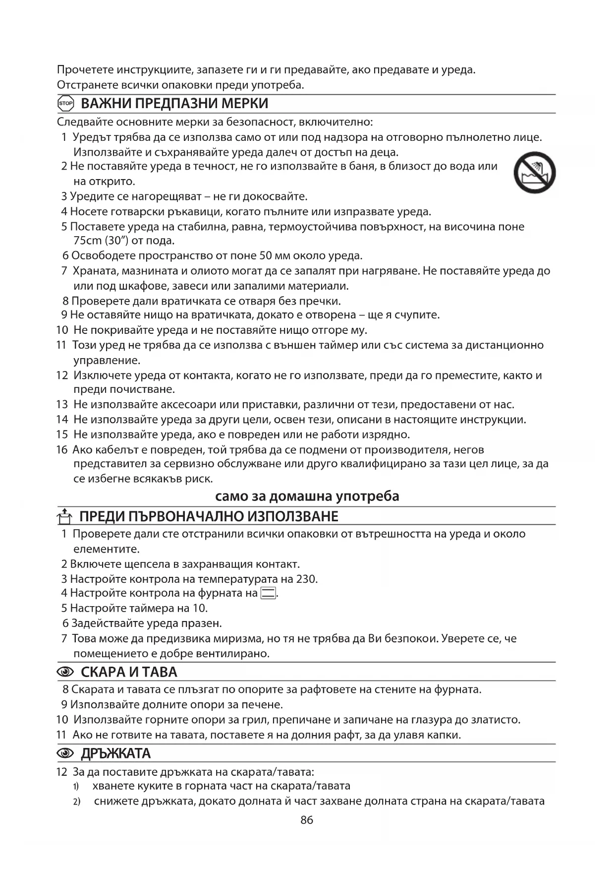 - Pentru alimente pre-ambalate, urmaţi instrucţiunile de pe ambalaj sau etichetă. alimente temperatură alimente temperatură carne de vită 190-210 °C patiserie 190-210 °C pâine 200-220 °C carne de porc 190-210 °C caserole 140-160 °C plăcintă/tartă cu fructe 160-180 °C pui 190-210 °C prăjitură cu fructe 140-160 °C peşte 170-190 °C biscuiţi 190-220 °C carne de miel 190-210 °C cozonac 160-180 °C bezea 90-110 °C budincă Yorkshire 200-220 °C budincă cu lapte 140-160 °C86 Прочетете инструкциите, запазете ги и ги предавайте, ако предавате и уреда. Отстранете всички опаковки преди употреба. A ВАЖНИ ПРЕДПАЗНИ МЕРКИ Следвайте основните мерки за безопасност, включително: 1 Уредът трябва да се използва само от или под надзора на отговорно пълнолетно лице. Използвайте и съхранявайте уреда далеч от достъп на деца. 2 Не поставяйте уреда в течност, не го използвайте в баня, в близост до вода или на открито. 3 Уредите се нагорещяват – не ги докосвайте. 4 Носете готварски ръкавици, когато пълните или изпразвате уреда. 5 Поставете уреда на стабилна, равна, термоустойчива повърхност, на височина поне 75cm (30”) от пода. 6 Освободете пространство от поне 50 мм около уреда. 7 Храната, мазнината и олиото могат да се запалят при нагряване. Не поставяйте уреда до или под шкафове, завеси или запалими материали. 8 Проверете дали вратичката се отваря без пречки. 9 Не оставяйте нищо на вратичката, докато е отворена – ще я счупите. 10 Не покривайте уреда и не поставяйте нищо отгоре му. 11 Този уред не трябва да се използва с външен таймер или със система за дистанционно управление. 12 Изключете уреда от контакта, когато не го използвате, преди да го преместите, както и преди почистване. 13 Не използвайте аксесоари или приставки, различни от тези, предоставени от нас. 14 Не използвайте уреда за други цели, освен тези, описани в настоящите инструкции. 15 Не използвайте уреда, ако е повреден или не работи изрядно. 16 Ако кабелът е повреден, той трябва да се подмени от производителя, негов представител за сервизно обслужване или друго квалифицирано за тази цел лице, за да се избегне всякакъв риск. само за домашна употреба U ПРЕДИ ПЪРВОНАЧАЛНО ИЗПОЛЗВАНЕ 1 Проверете дали сте отстранили всички опаковки от вътрешността на уреда и около елементите. 2 Включете щепсела в захранващия контакт. 3 Настройте контрола на температурата на 230. 4 Настройте контрола на фурната на H. 5 Настройте таймера на 10. 6 Задействайте уреда празен. 7 Това може да предизвика миризма, но тя не трябва да Ви безпокои. Уверете се, че помещението е добре вентилирано. C СКАРА И ТАВА 8 Скарата и тавата се плъзгат по опорите за рафтовете на стените на фурната. 9 Използвайте долните опори за печене. 10 Използвайте горните опори за грил, препичане и запичане на глазура до златисто. 11 Ако не готвите на тавата, поставете я на долния рафт, за да улавя капки. C ДРЪЖКАТА 12 За да поставите дръжката на скарата/тавата: a) хванете куките в горната част на скарата/тавата b) снижете дръжката, докато долната й част захване долната страна на скарата/тавата87 инструкции (Български) c) вдигнете дръжката и скарата/тавата ще излезе с нея d) горните куки обхващат тавата, а долните – скарата C ИЗПОЛЗВАНЕ НА ФУРНАТА 13 Включете щепсела в захранващия контакт. 14 Задайте необходимата температура (100-230°C) чрез копчето за контрол на температурата. 15 Настройте фурната на необходимата ви функция. / всички елементи са изключени O горен елемент и грил F долен елемент H и двата елемента 16 Завъртете таймера по посока на часовниковата стрелка до желаното време. Лампичката