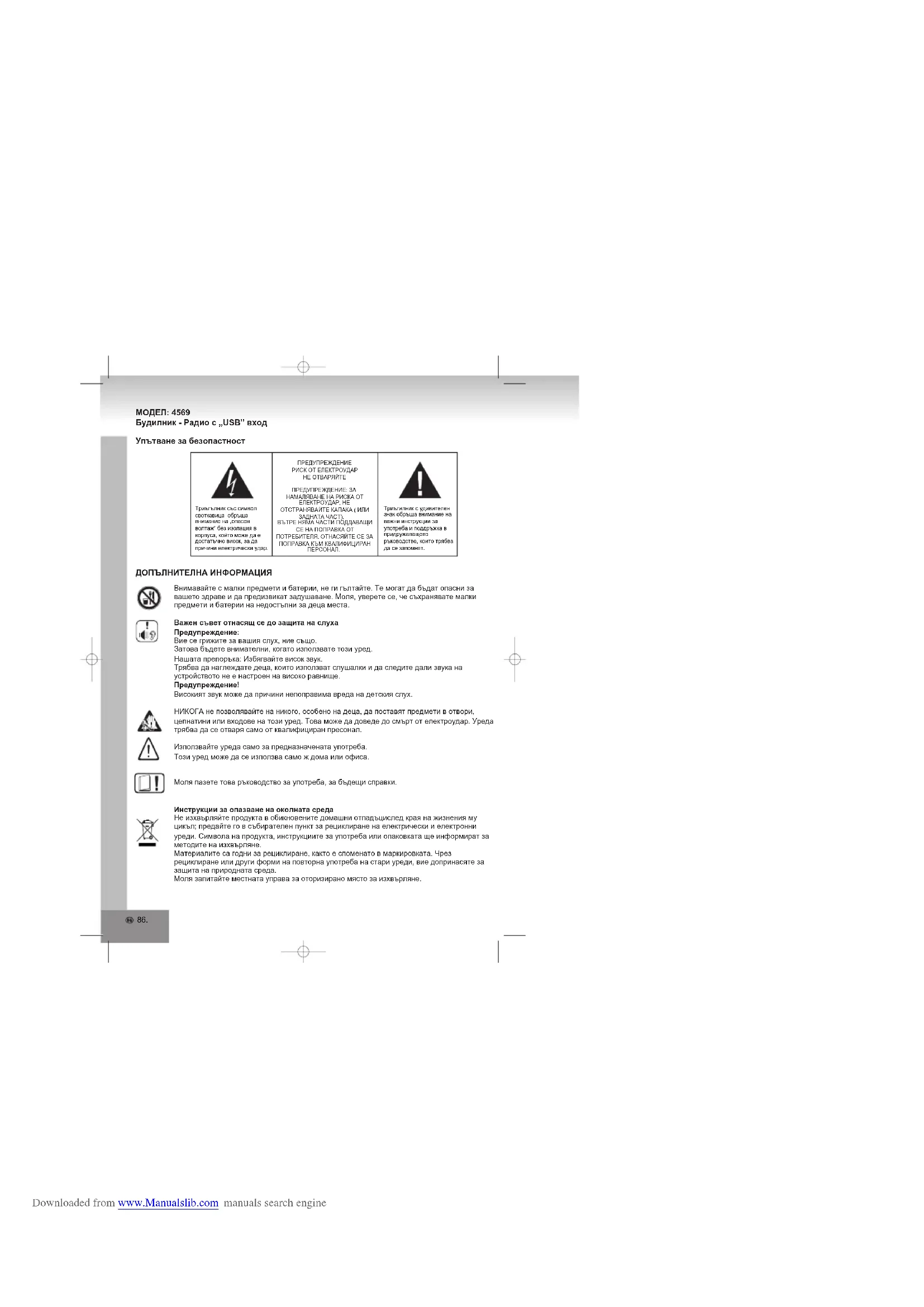 Downloaded from www.Manualslib.com manuals search engine86. МОДЕЛ: 4569 Будилник - Радио с „USB” вход Упътване за безопастност Триъгилник с удивителен знак обръща внимание на важни инструкции за употреба и поддръжка в придружаващото ръководство, които трябва да се запомнят.Триъгълник със символ светкавица обръща внимание на „опасен волтаж” без изолация в корпуса, който може да е достатъчно висок, за да причини електрически удар.Внимавайте с малки предмети и батерии, не ги гълтайте. Те могат да бъдат опасни за вашето здраве и да предизвикат задушаване. Моля, уверете се, че съхранявате малки предмети и батерии на недостъпни за деца места.Важен съвет отнасящ се до защита на слухаПредупреждение:Вие се грижите за вашия слух, ние също. Затова бъдете внимателни, когато използвате този уред.Нашата препоръка: Избягвайте висок звук.Трябва да наглеждате деца, които използват слушалки и да следите дали звука на устройството не е настроен на високо равнище.Предупреждение!Високият звук може да причини непоправима вреда на детския слух.НИКОГА не позволявайте на никого, особено на деца, да поставят предмети в отвори, цепнатини или входове на този уред. Това може да доведе до смърт от електроудар. Уреда трябва да се отваря само от квалифициран пресонал. Използвайте уреда само за предназначената употреба.Този уред може да се използва само ж дома или офиса.Моля пазете това ръководство за употреба, за бъдещи справки.Инструкции за опазване на околната средаНе изхвърляйте продукта в обикновените домашни отпадъцислед края на жизнения му цикъл; предайте го в събирателен пункт за рециклиране на електрически и електронни уреди. Символа на продукта, инструкциите за употреба или опаковката ще информират за методите на изхвърляне. Материалите са годни за рециклиране, както е споменато в маркировката. Чрез рециклиране или други форми на повторна употреба на стари уреди, вие допринасяте за защита на природната среда. Моля запитайте местната управа за оторизирано място за изхвърляне. ДОПЪЛНИТЕЛНА ИНФОРМАЦИЯ ПРЕДУПРЕЖДЕНИЕРИСК ОТ ЕЛЕКТРОУДАРНЕ ОТВАРЯЙТЕПРЕДУПРЕЖДЕНИЕ: ЗА НАМАЛЯВАНЕ НА РИСКА ОТ ЕЛЕКТРОУДАР, НЕ ОТСТРАНЯВАЙТЕ КАПАКА ( ИЛИ ЗАДНАТА ЧАСТ).ВЪТРЕ НЯМА ЧАСТИ ПОДДАВАЩИ СЕ НА ПОПРАВКА ОТ ПОТРЕБИТЕЛЯ. ОТНАСЯЙТЕ СЕ ЗА ПОПРАВКА КЪМ КВАЛИФИЦИРАН ПЕРСОНАЛ. Downloaded from www.Manualslib.com manuals search engine87. Не препречвайте вентилацията на уреда. Уверете се че пердета, вестници, мебели или други предмети не блокират вентилационната система на апарата. Вентилационната система трябва да може да функционира по всяко време! Прегряването може да доведе до сериозна повреда на уреда и да намали неговото функциониране и живот.Горещина и топлинаНе излагайте уреда на пряка слънчева светлина. Уверете се, че уреда не е изложен на директни топлинни източници като радиатори или огън. Уверете се, че вентилационните отвори на уреда на са закрити. Влага и почистванеТози уред не е водоустойчив! Не го потаяйте във вода. Не позволявайте вода да попада върху уреда. Ако вода влезе в уреда, това може да предизвика сериозна повреда. Не използвайте почистващи препарати, които съдържат алкохол, амоняк, бензен или драскащи повърхности, тъй като те могат да повредят уреда. За почистване използвайте мека, влажна кърпа.Професионално рециклиранеБатерии и опаковки не трябва да се изхвърлят в общите отпадъци. Батерии трябва д