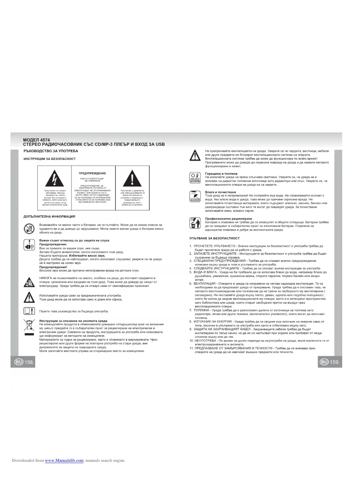 Триъгълник със символ светкавица обръща внимание на „опасен волтаж” без изолация в кабинета, който може да е достатъчно висок, за да причини електрически удар.Триъгилник с удивителен знак обръща внимание на важни инструкции за употреба и поддръжка в придружаващото ръководство, които трябва да се запомнят.ПРЕДУПРЕЖДЕНИЕРИСК ОТ ЕЛЕКТРОУДАРНЕ ОТВАРЯЙТЕПРЕДУПРЕЖДЕНИЕ: ЗА НАМАЛЯВАНЕ НА РИСКА ОТ ЕЛЕКТРОУДАР, НЕ ОТСТРАНЯВАЙТЕ КАПАКА ( ИЛИ ЗАДНАТА ЧАСТ).ВЪТРЕ НЯМА ЧАСТИ ПОДДАВАЩИ СЕ НА ПОПРАВКА ОТ ПОТРЕБИТЕЛЯ. ОТНАСЯЙТЕ СЕ ЗА ПОПРАВКА КЪМ КВАЛИФИЦИРАН ПЕРСОНАЛ.МОДЕЛ 4574СТЕРЕО РАДИОЧАСОВНИК СЪС CD/MP-3 ПЛЕЪР И ВХОД ЗА USBПазете това ръководство за бъдеща употреба.Инструкции за опазване на околната средаНе изхвърляйте продукта в обикновените домашни отпадъцислед края на жизнения му цикъл; предайте го в събирателен пункт за рециклиране на електрически и електронни уреди. Символа на продукта, инструкциите за употреба или опаковката ще информират за методите на изхвърляне.Материалите са годни за рециклиране, както е споменато в маркировката. Чрез рециклиране или други форми на повторна употреба на стари уреди, вие допринасяте за защита на природната среда.Моля запитайте местната управа за оторизирано място за изхвърляне.НИКОГА не позволявайте на никого, особено на деца, да поставят предмети в отвори, цепнатини или входове на този уред. Това може да доведе до смърт от електроудар. Уреда трябва да се отваря само от квалифициран пресонал. Внимавайте за малки части и батерии, не ги гълтайте. Може да се окаже опасно за здравето ви и да доведе до задушаване. Моля пазете малки уреди и батерии извън обсега на деца.Важен съвет отнасящ се до защита на слухаПредупреждение:Вие се грижите за вашия слух, ние също.Затова бъдете внимателни, когато използвате този уред.Нашата препоръка: Избягвайте висок звук.Децата трябва да се наблюдават, когато използват слушалки; уверете се че уреда не е настроен на силен звук.Предупреждение!Високия звук може да причини непоправима вреда на детския слух.Използвайте уреда само за предназначената употреба.Този уред може да се използва само ж дома или офиса.РЪКОВОДСТВО ЗА УПОТРЕБАИНСТРУКЦИИ ЗА БЕЗОПАСНОСТДОПЪЛНИТЕЛНА ИНФОРМАЦИЯУПЪТВАНЕ ЗА БЕЗОПАСТНОСТ1. ПРОЧЕТЕТЕ УПЪТВАНЕТО - Всички инструкции за безопастност и употреба трябва да бъдат прочетени преди да се работи с уреда.2. ЗАПАЗЕТЕ ИНСТРУКЦИИТЕ - Инструкциите за безопастност и употреба трябва да бъдат съхранени за бъдеща справка.3. СПЕЦИАЛНИ ПРЕДУПРЕЖДЕНИЯ - Трябва да се спазват всички предупреждения изписани върху уреда и тези в упътването за употреба.4. СЛЕДВАЙТЕ ИНСТРУКЦИИТЕ - Трябва да се спазват всички инструкции за употреба.5. ВОДА И ВЛАГА - Уреда не би трябвало да се използва близо до вода, например близо до душкабина, умивалник, кухненска мивка, открита пералня, плувен басейн или мокро антре.6. ВЕНТИЛАЦИЯ - Отворите в уреда са направени за негова надеждна вентилация. Те са необходими за да предпазват уреда от прегряване. Уреда трябва да е поставен така, че неговото местонахождение или положение да не пречи за свободното му вентилиране (охлаждане). Не поставяйте уреда върху легло, диван, одеало или подобна повърхност, която би могла да закрие вентилационните му отвори, както и в затворени пространства като библиотека или шкаф, които спират свободния приток н