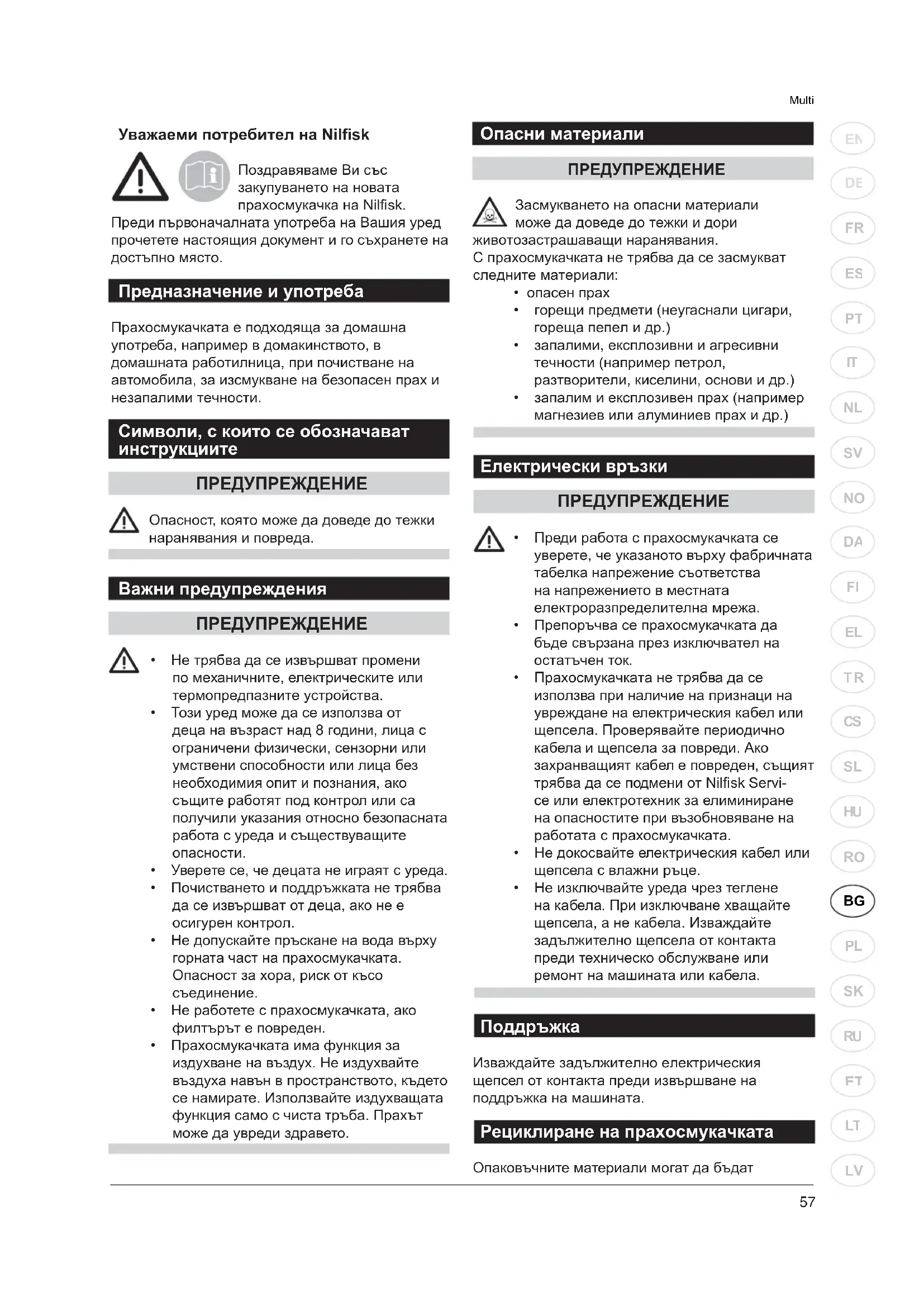 Уважаеми потребител на Nilfi sk Поздравяваме Ви със закупуването на новата прахосмукачка на Nilfi sk. Преди първоначалната употреба на Вашия уред прочетете настоящия документ и го съхранете на достъпно място. Предназначение и употреба Прахосмукачката е подходяща за домашна употреба, например в домакинството, в домашната работилница, при почистване на автомобила, за изсмукване на безопасен прах и незапалими течности. Символи, с които се обозначават инструкциите ПРЕДУПРЕЖДЕНИЕ Опасност, която може да доведе до тежки наранявания и повреда. Важни предупреждения ПРЕДУПРЕЖДЕНИЕ