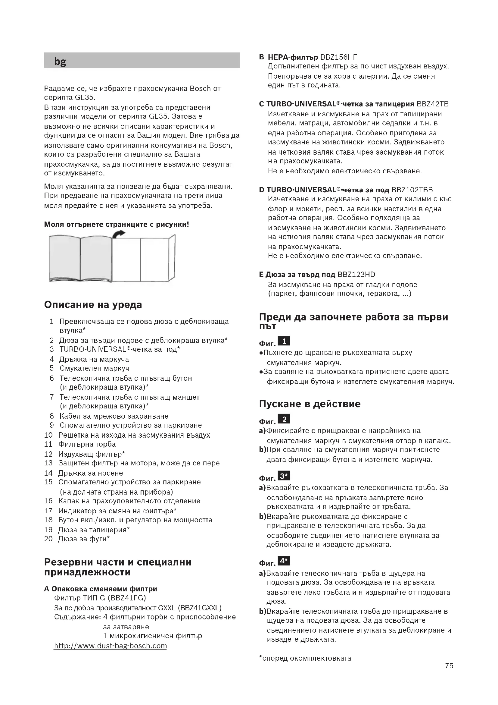 2 Дюза за твърди подове с деблокираща втулка* 3 TURBO-UNIVERSAL®-четка за под* 4 Дръжка на маркуча 5 Смукателен маркуч 6 Телескопична тръба с плъзгащ бутон (и деблокираща втулка)* 7 Телескопична тръба с плъзгащ маншет (и деблокираща втулка)* 8 Кабел за мрежово захранване 9 Спомагателно устройство за паркиране 10 Решетка на изхода на засмуквания въздух 11 Филтърна торба 12 Издухващ филтър* 13 Защитен филтър на мотора, може да се пере 14 Дръжка за носене 15 Спомагателно устройство за паркиране (на долната страна на прибора) 16 Капак на прахоуловителното отделение 17 Индикатор за смяна на филтъра* 18 Бутон вкл./изкл. и регулатор на мощността 19 Дюза за тапицерия* 20 Дюза за фуги* Резервни части и специални принадлежности A Опаковка сменяеми филтри Филтър ТИП G (BBZ41FG) За по-добра производителност GXXL (BBZ41GXXL) Съдържание: 4 филтърни торби с приспособление за затваряне 1 микрохигиеничен филтър http://www.dust-bag-bosch.com